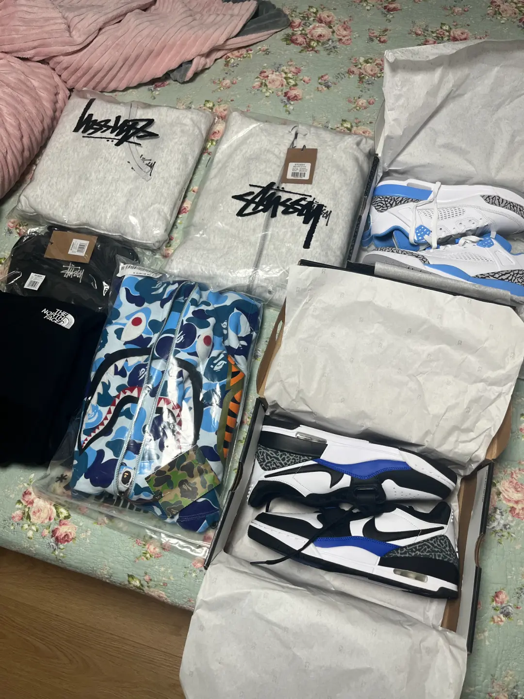 The items arrived, so I opened them up to take a look. The Bape hoodie feels better than I expected. The Jordan AJ1 has nice attention to detail. The Stussy hoodie has a great texture and is visibly thick.