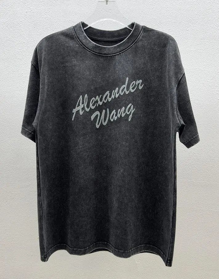 AW Alexander Wang Classic Streetwear Collection Rhinestone-embellished Vintage Washed Charcoal Gray Short-sleeve T-shirt