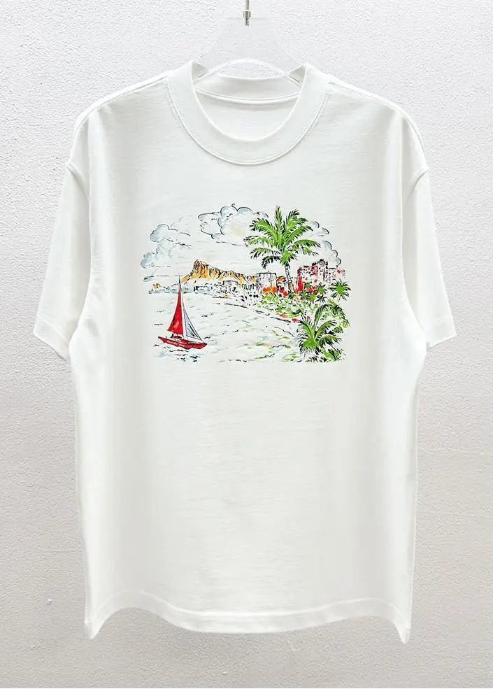 Crafted from skin-friendly, breathable combed pure cotton with original hand-painted positioned printing technique, it exudes a relaxing, laid-back seaside vacation vibe. Versatile for daily outings and commutes and flattering for all, this piece is wildly sought after by young trendsetters, and is a popular, well-received casual staple for summer.
