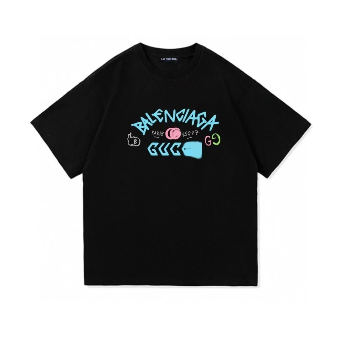 Balenciaga Co-branded Graffiti Collection Black Street-style Short-sleeve T-shirt. Crafted from heavy-weight pure cotton fabric, it is breathable, skin-friendly, well-structured and stays crisp in shape. Featuring custom graffiti spray printing technique, the pattern is trendy, cool, durable and colorfast with maximum recognition. As a versatile street outing item highly sought after in the trend community, it boasts excellent reputation and is widely favored by streetwear enthusiasts across the globe.
