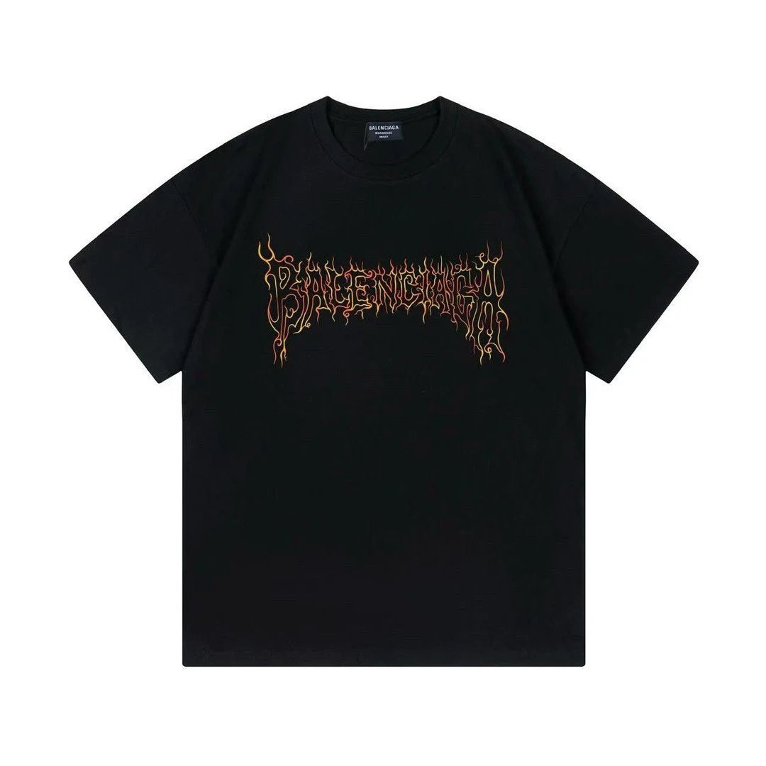 Balenciaga Gothic Flame Series Black Short-sleeve T-Shirt. Crafted from selected premium heavy-weight pure cotton, it is skin-friendly, breathable, crisp in shape and resistant to deformation after long-term wear. The loose silhouette offers great inclusivity for different body types. Adopting high-definition color-fast printing technology, the gothic flame pattern is edgy, eye-catching and delivers strong recognition. It features the dark gothic high-street cool style, and is an iconic popular trendy item of the brand deeply sought after by fashionistas around the globe. It is extremely eye-catching when paired with jeans or workwear for daily wear.
