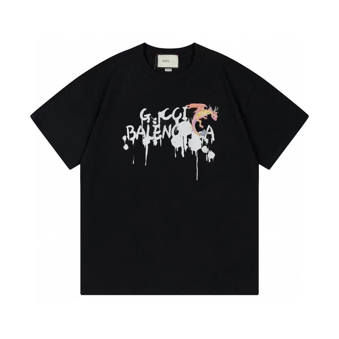 This black street-style short-sleeve T-shirt is from Balenciaga’s Graffiti Dragon Collection. Made of selected heavy-weight combed pure cotton, it is skin-friendly, breathable and resistant to deformation even after long-term wear. The graffiti dragon pattern adopts high-end color-fixing printing technology, with clear layers, full and vibrant color, and excellent resistance to cracking and paint peeling. Featuring a personalized street trend style, it is versatile and eye-catching for daily outings. It has been an extremely popular trendy item of Balenciaga in recent years, and is deeply sought after by fashion lovers around the world.