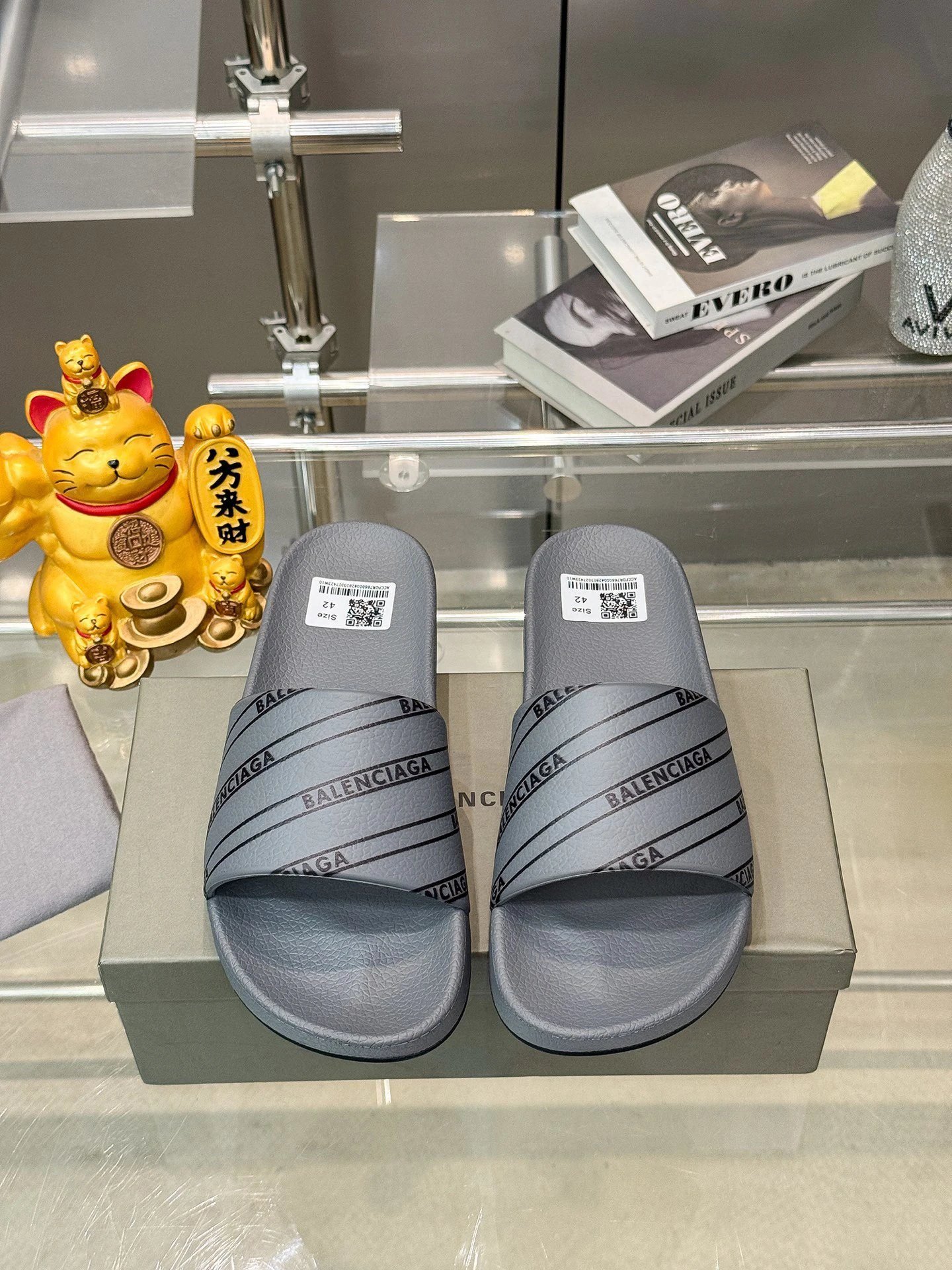 Balenciaga Grey Trendy Slides from the Twill Print Collection falls into the brand’s popular casual footwear category. The upper is crafted from premium twill fabric via digital positioning printing technology. The outsole is made of wear-resistant and anti-slip rubber. Boasting a high-street trendy style, it is casual, cool and easy to match. It is a popular item highly sought after by fashion trendsetters in summer, which is versatile, outstanding and enjoys an excellent reputation.