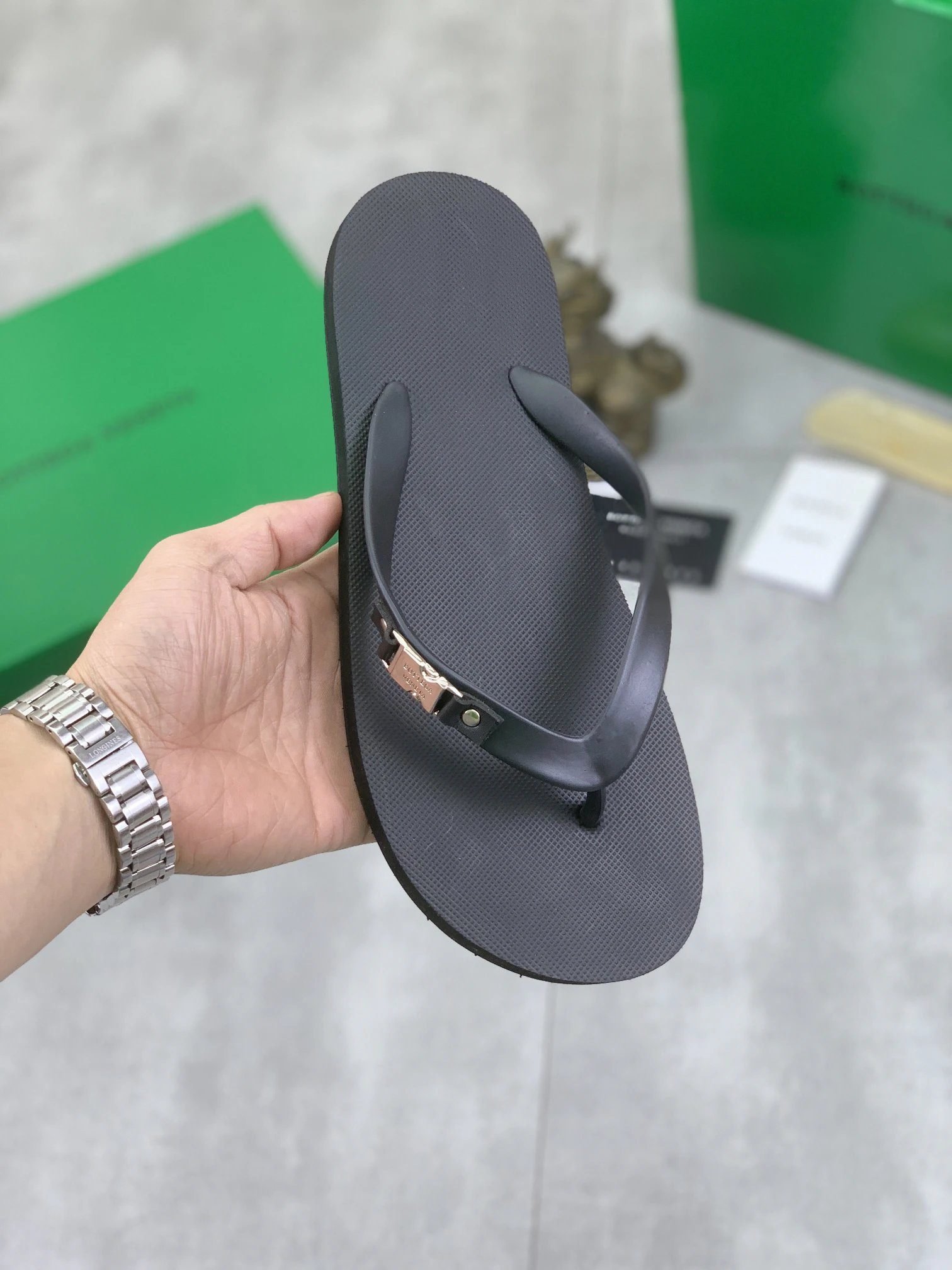 This is a pair of black flip-flops from the classic minimalist collection of luxury brand BOTTEGA VENETA. The thong vamp is made of high-elasticity and flexible imported virgin rubber, formed through integrated molding process with no extra logo design, which carries forward the brand’s iconic minimalist high-end style. It features soft, elastic and comfortable foot feel that will not rub feet, and is versatile for daily outings and seaside vacations. It has been a popular item highly sought after by high-level fashion insiders in recent years with outstanding public praise.