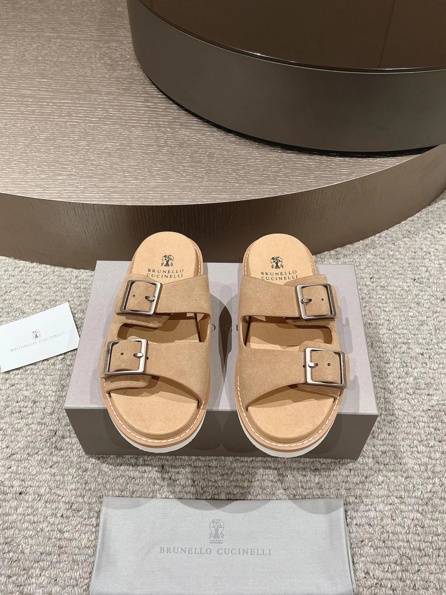 Tan buckle slide sandals from the casual collection of ultra-luxury brand Brunello Cucinelli: The upper is crafted from imported full-grain cowhide, and the inner lining is made of skin-friendly soft sheepskin. Adopting the brand’s iconic hand-stitching technique, the edges are exquisitely polished with meticulous workmanship. Featuring a relaxed and high-end Italian casual style, the sandals are soft on the feet and will not rub skin, can be matched with various types of clothing, and are a highly sought-after item for street outings and vacations favored by high-end fashion lovers with outstanding reputation.