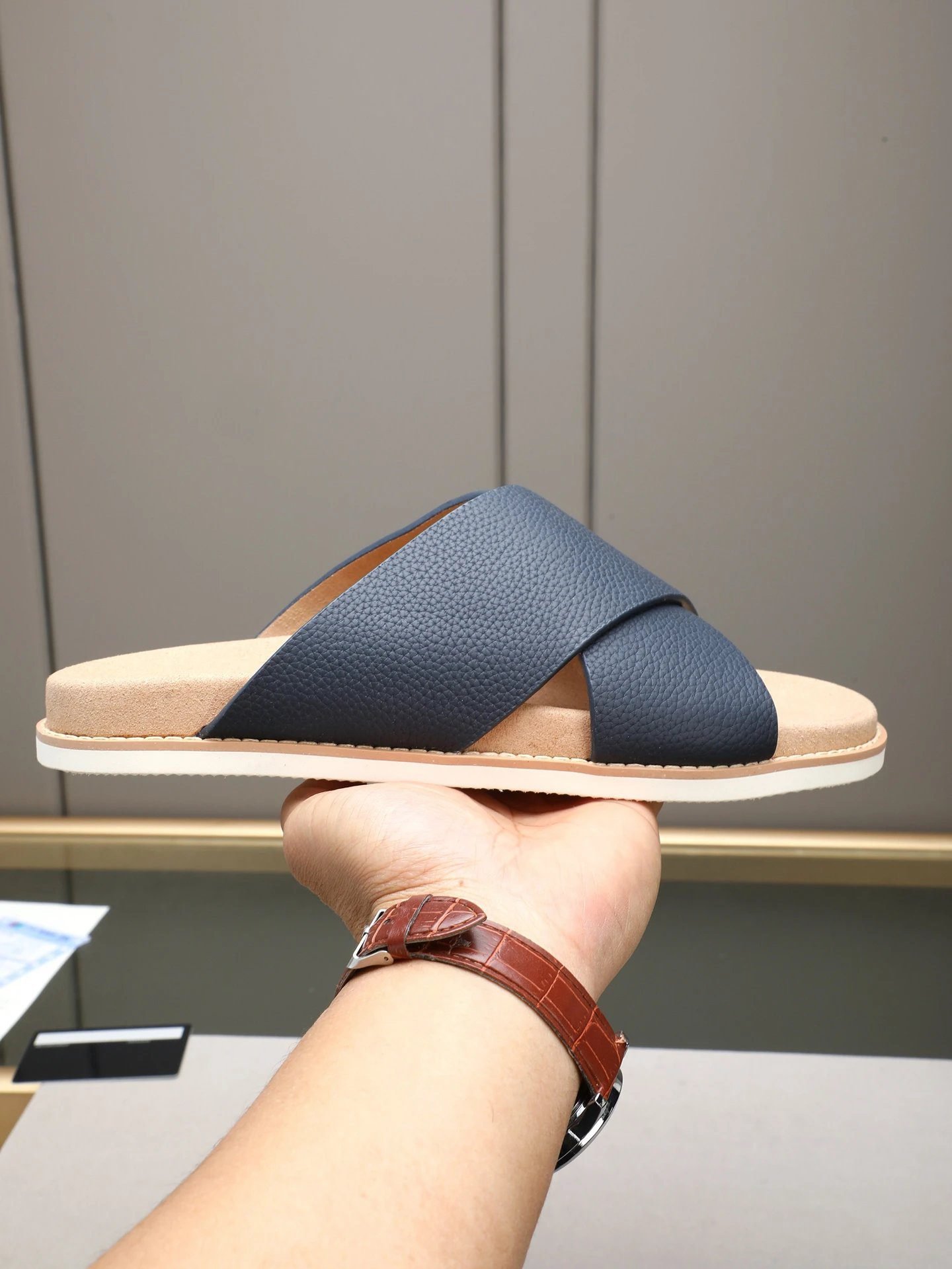 Brunello Cucinelli Classic Casual Collection Navy Genuine Leather Slide Sandals. Made of selected premium top-grain soft cowhide, it adopts the brand’s iconic hand tanning process, featuring a fine and supple leather texture, and a minimalist casual style with high-end luxury vibe. Comfortable and breathable to wear, it is suitable for daily outings and vacations, and is a well-reputed style deeply favored by high-end connoisseurs in the ultra-luxury footwear industry.
