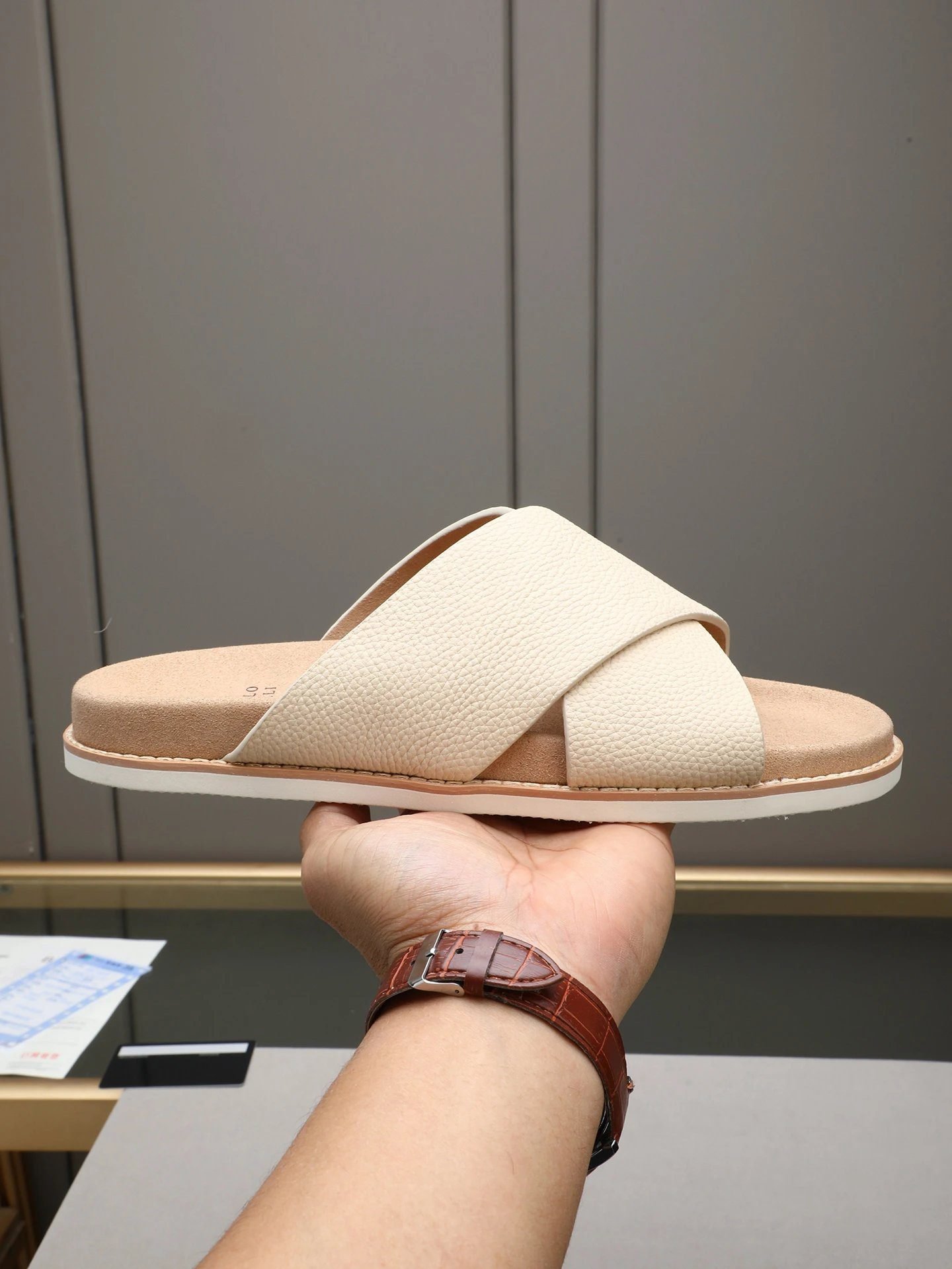 Italian ultra-luxury brand Brunello Cucinelli’s cross-strap genuine leather slide sandals from the casual collection, featured in beige tone. The upper is crafted from imported full-grain cowhide and polished with the brand’s classic hand-tanning process. The leather is delicate, flexible and comfortable for wear, boasting a relaxed, high-end and versatile style that is perfectly suitable for daily outings and vacation trips. It is a high-end casual footwear style highly sought after by urban elites.