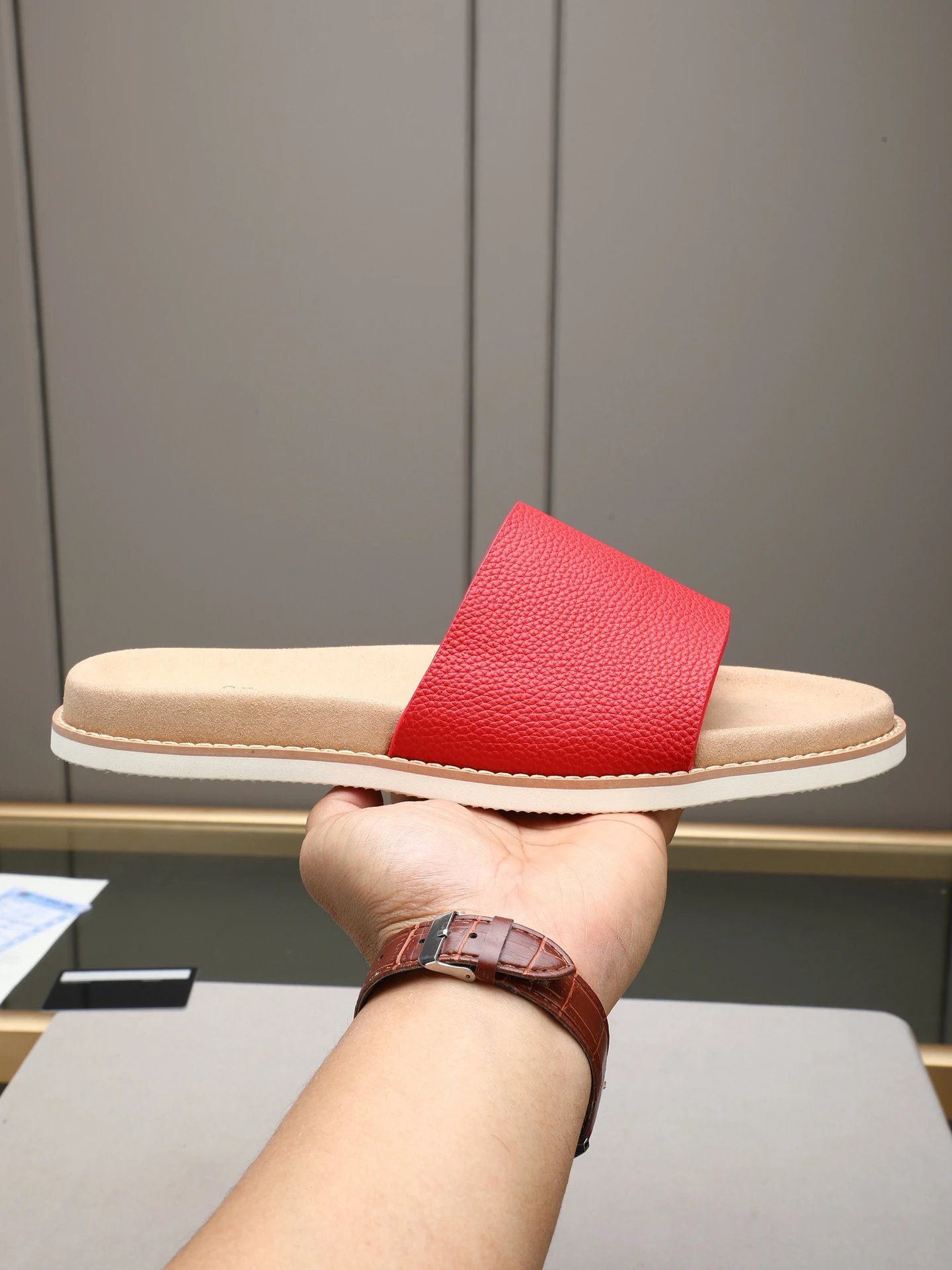 Red slide sandals from the casual collection of Italian top luxury brand Brunello Cucinelli. The upper is made of fine-textured full-grain calfskin, and the lining is skin-friendly sheepskin. Meticulously crafted in line with the brand’s consistent hand-sewing craftsmanship, it features full and premium color, a relaxed casual style with inherent understated luxury texture. It feels fresh and breathable when worn, matches various casual summer outfits, and is a well-reputed shoe style highly sought after by high-end quality enthusiasts.