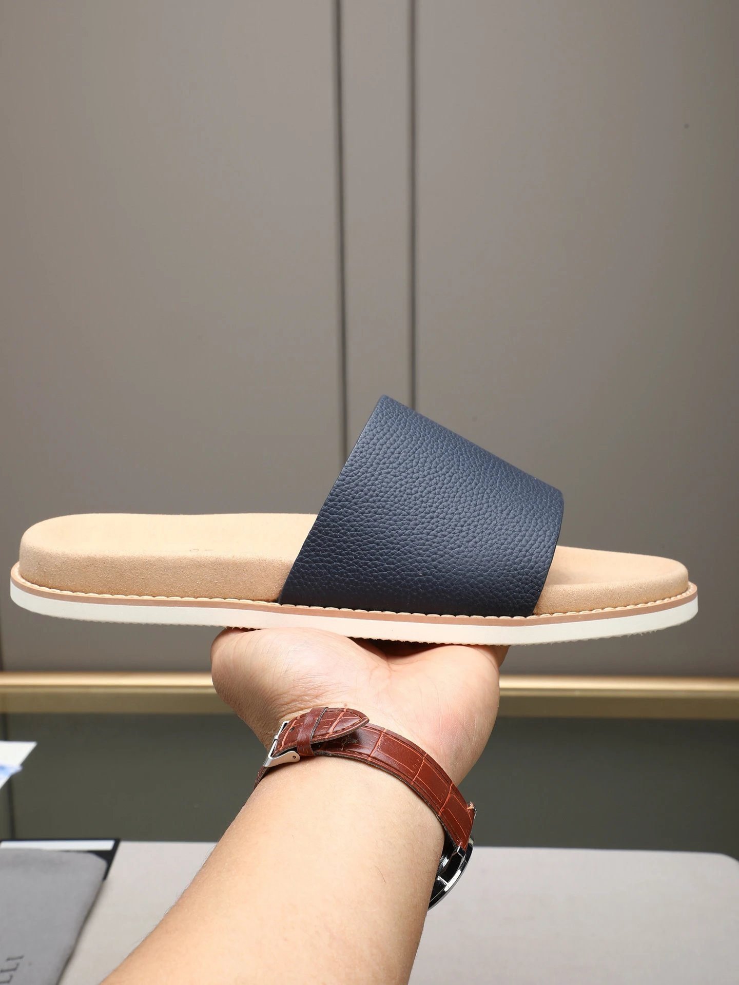 Italian luxury brand Brunello Cucinelli’s minimalist navy slide sandals from the classic casual collection. The upper is crafted from premium full-grain calfskin, featuring the brand’s iconic hand-tanned stitching technique. Delivering a soft and breathable foot feel, it boasts a minimalist, high-end casual style and is widely favored by quality-focused trendsetters. It is a well-received accessible luxury footwear style, versatile enough for daily outings and vacations.
