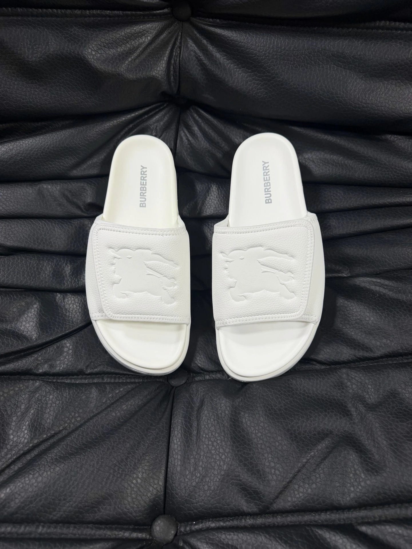 This is the minimalist white slide from Burberry’s Classic Knight Logo Collection. The upper is crafted from top-grain cowhide, and the rubber outsole is treated with anti-slip and wear-resistant technology, which offers comfortable foot feel and keeps feet from getting stuffy. Adorned with the iconic heat-embossed knight logo, it features a premium minimalist British style, pairs perfectly with all kinds of summer outfits, is a popular style highly sought after by trendsetters, and is suitable for daily outings and casual occasions.