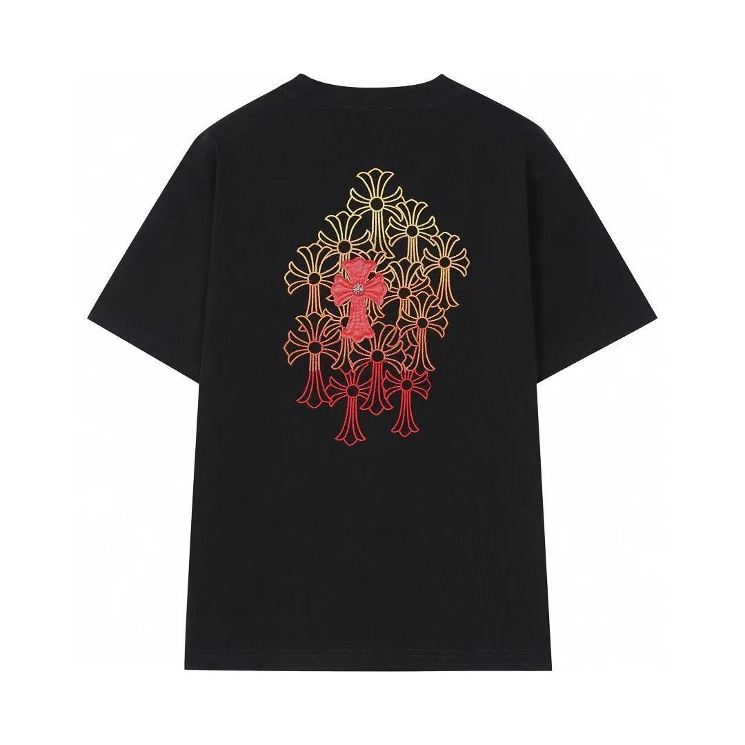 Chrome Hearts Classic Cross Collection Black Street-style Short-sleeve T-shirt. Made of heavy-weight pure cotton, it is skin-friendly and breathable. The heavy-crafted three-dimensional cross embroidery features extremely high recognition, and the cool high-street style is casual and versatile. It looks stunning and photo-ready when paired with jeans or cargo pants. As the most popular classic trendy piece from Chrome Hearts, it is deeply sought after by trendsetters around the world and enjoys an excellent reputation.