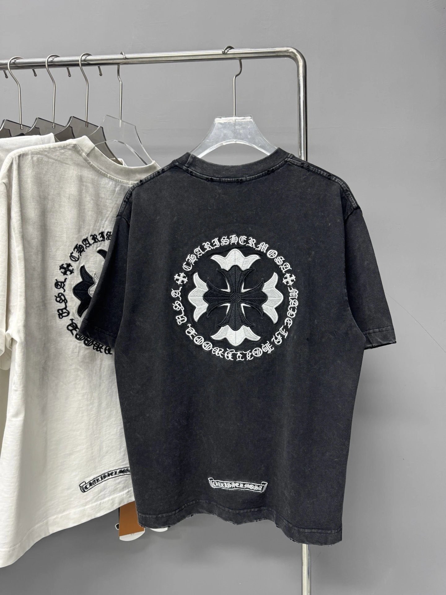 This is the black short-sleeve T-shirt from Chrome Hearts’ classic Cross collection. Crafted from heavyweight pure cotton, it is treated with vintage distressed washing process and decorated with the brand’s iconic cross embroidery. Featuring the signature American high street style, as one of Chrome Hearts’ most popular breakout hits, it is deeply sought after by trendsetters around the world. It is perfect for daily matching with jeans and casual pants to deliver great outfit photos, and is widely recognized as a must-have versatile fashion item in the trend circle.
