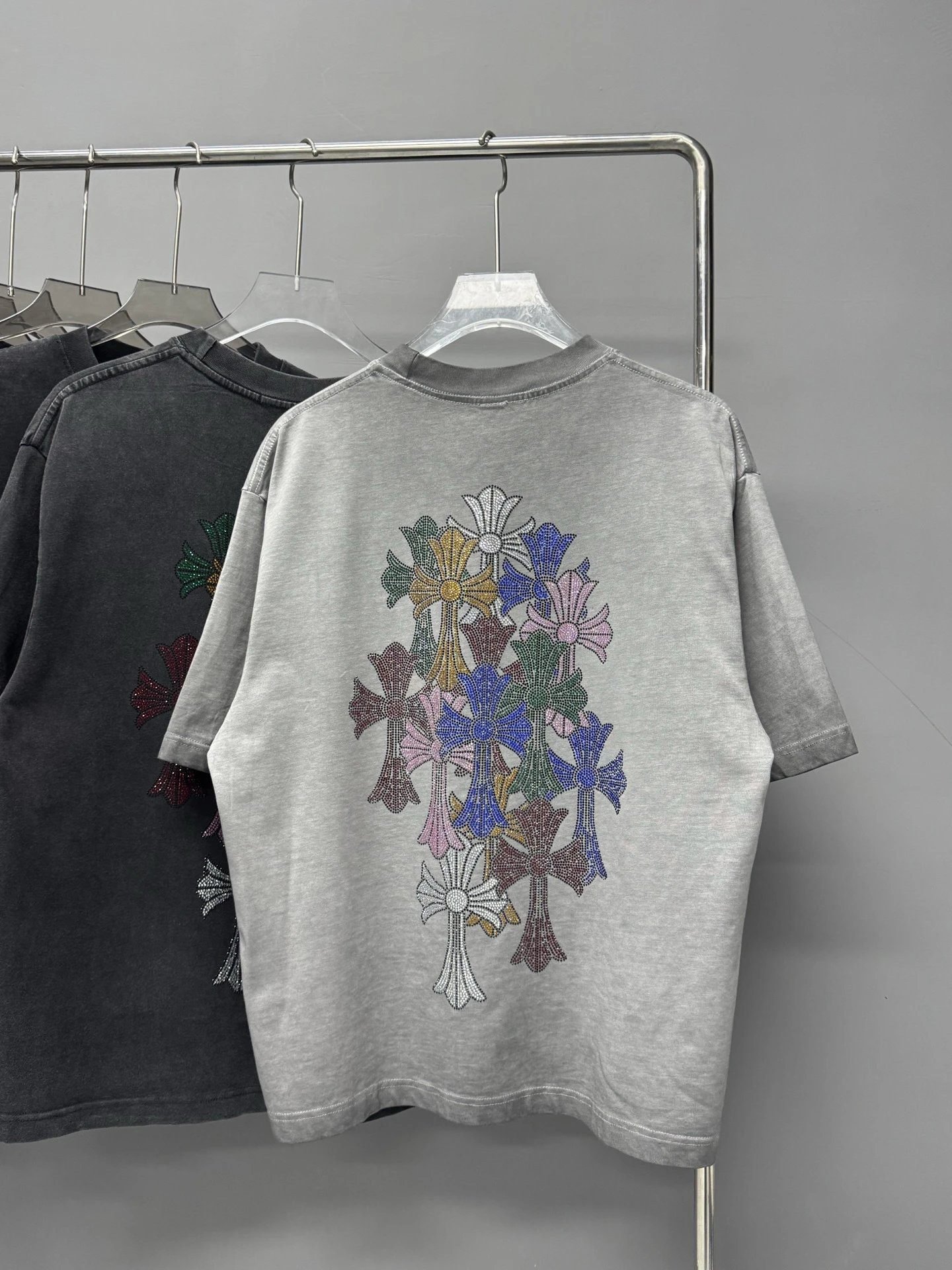 Chrome Hearts Cross Hot-Fix Rhinestone Street Style Light Grey T-Shirt