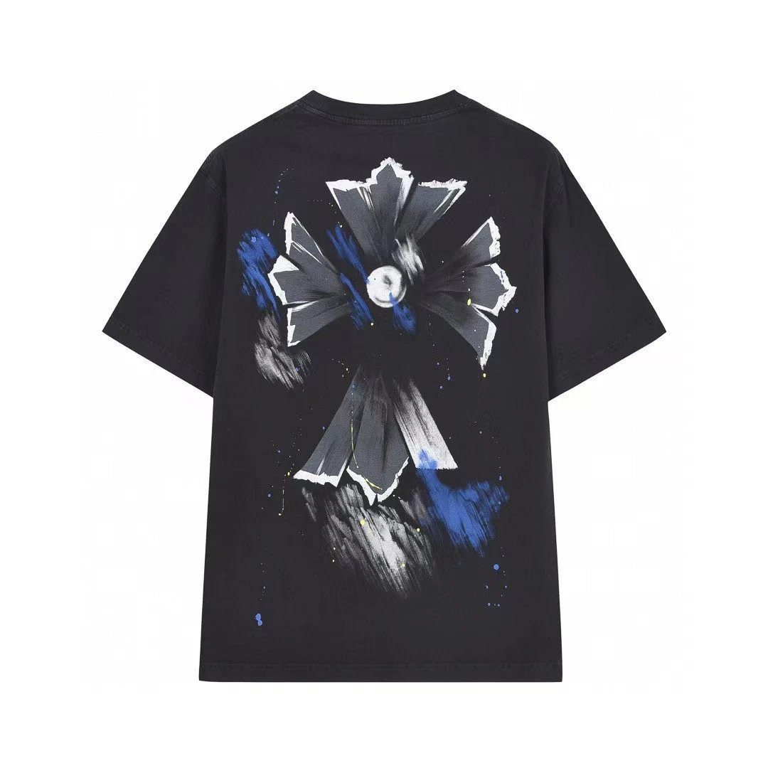 Black street-style short-sleeve T-shirt from the Ink-Splatter Cross Collection of Chrome Hearts, America’s top-tier streetwear brand. Made of heavyweight high-count pure cotton, it is skin-friendly, breathable, structured, durable and resistant to deformation. Crafted with hand-customized ink-splatter printing technology, it features a casual, eye-catching look with outstanding recognition. It is a classic hit most sought after by global fashionistas from Chrome Hearts. It is incredibly photogenic when paired with daily jeans or cargo pants, and is a popular must-have item for fashionistas going out.