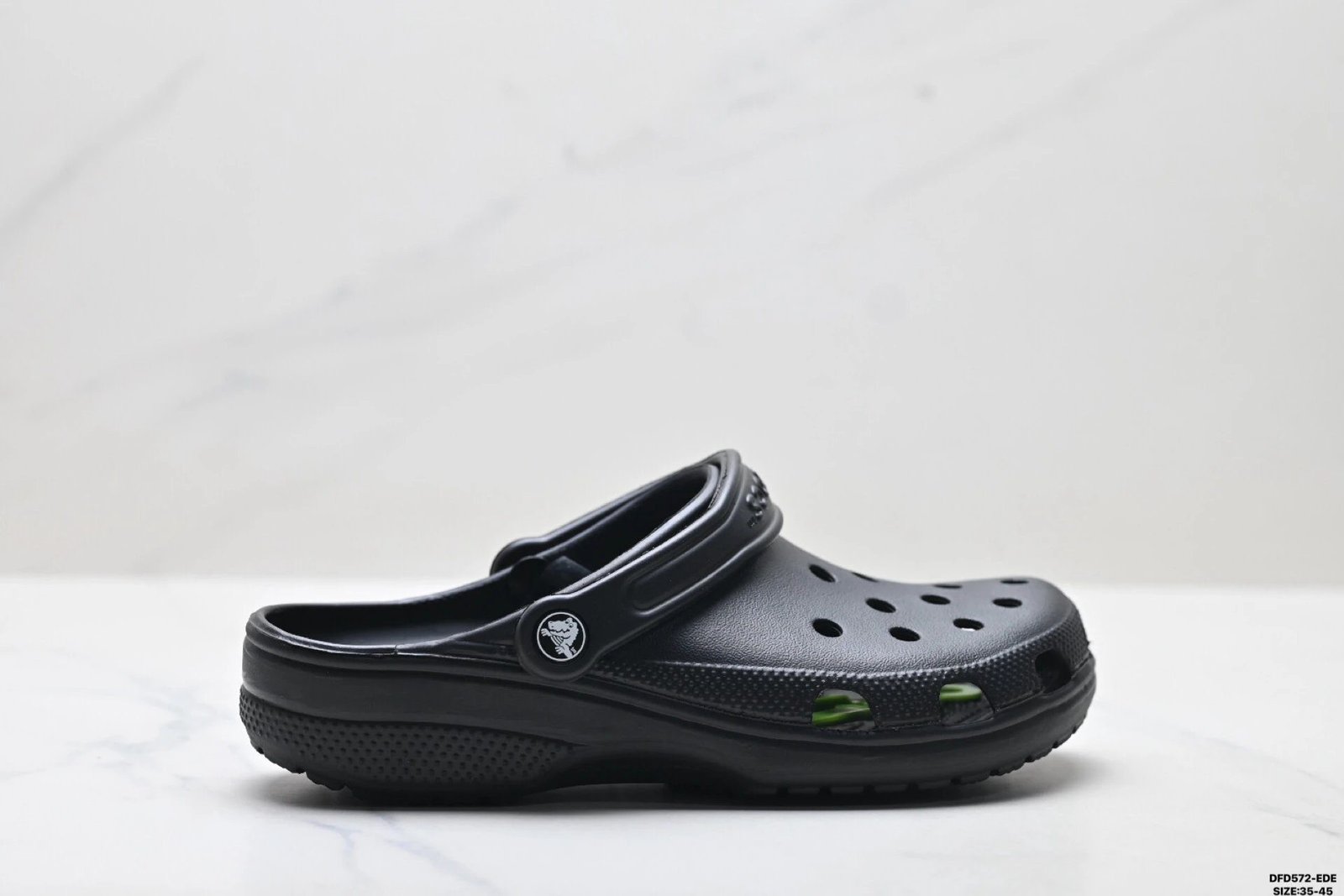 This is a pair of Crocs Classic Clog series clog shoes, with a simple black style. The upper is made of lightweight material and the craftsmanship is exquisite. Its style is casual and versatile, suitable for both shorts and long pants. Crocs is known for its comfort, and this clog shoe has an excellent reputation. It is a must-have fashion item for trendy people, adding personality and comfort to your outfit.
