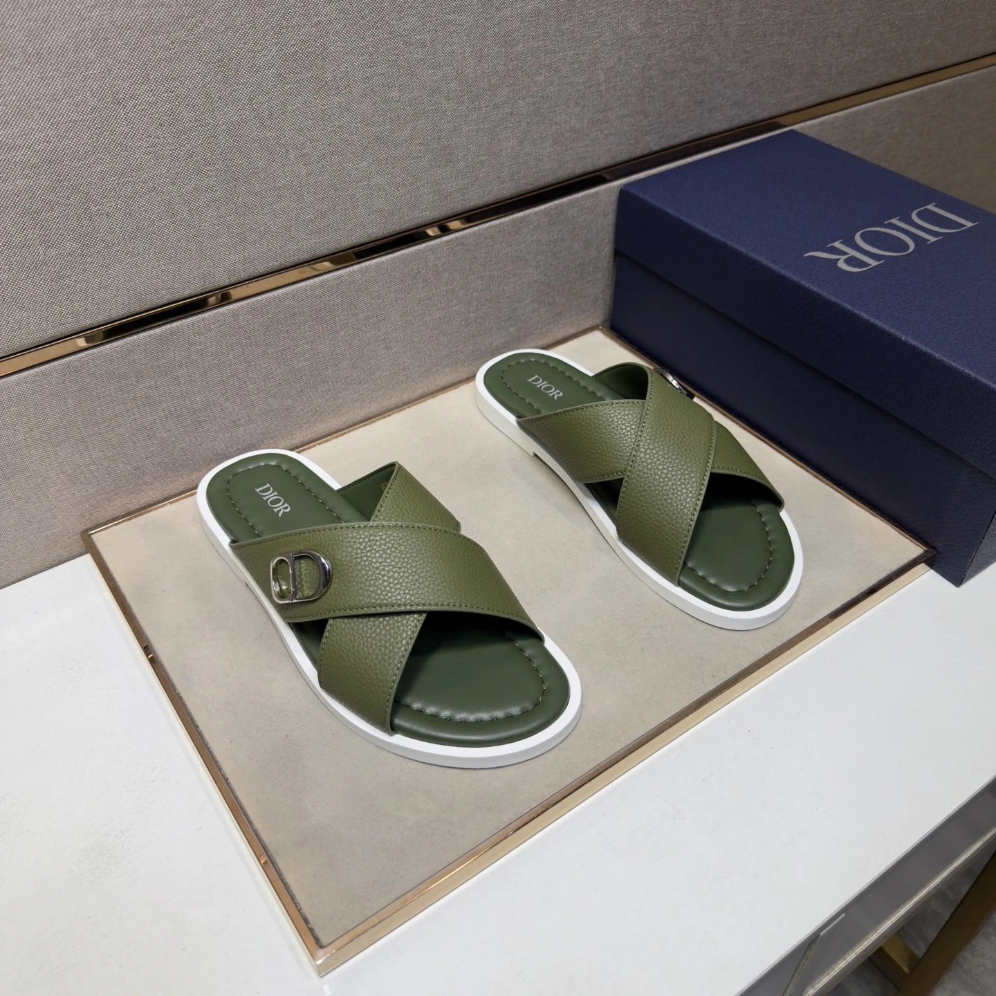 Dior Crisscross-strap Light Luxury Style Army Green Slides