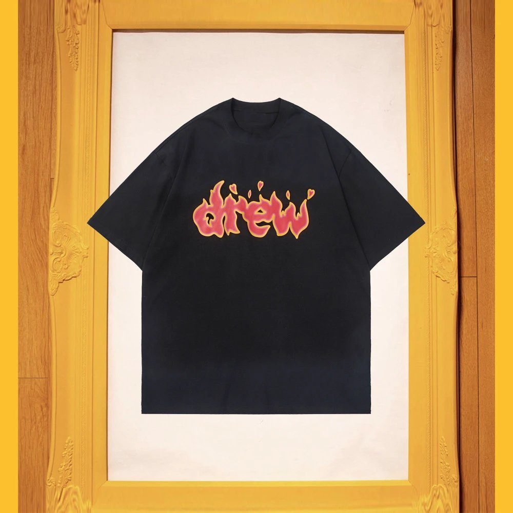 The black street-style short-sleeve T-shirt from the Flame Heart Collection of DREW, the streetwear brand founded by Justin Bieber, is made of heavy-weight skin-friendly pure cotton fabric and adopts high-definition color-fast reactive printing technology, which will not fade or crack after repeated washing. Featuring a loose casual fit and versatile casual American street style, it is a popular street item currently sought after and widely acclaimed by fashionistas.