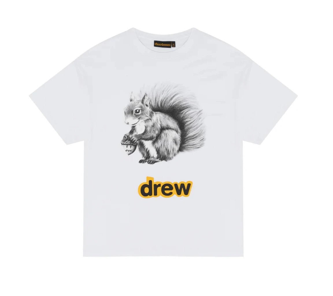 Classic Squirrel Print Collection Street-style White Short-sleeve T-shirt from DREW, the streetwear brand helmed by Justin Bieber. Made of skin-friendly, breathable heavyweight pure cotton, it adopts high-definition digital direct printing technology to guarantee firm and crack-resistant prints. Featuring casual American street style, this versatile piece fits all body types. It is a hot item deeply sought after by global trendsetters and boasts an outstanding reputation.