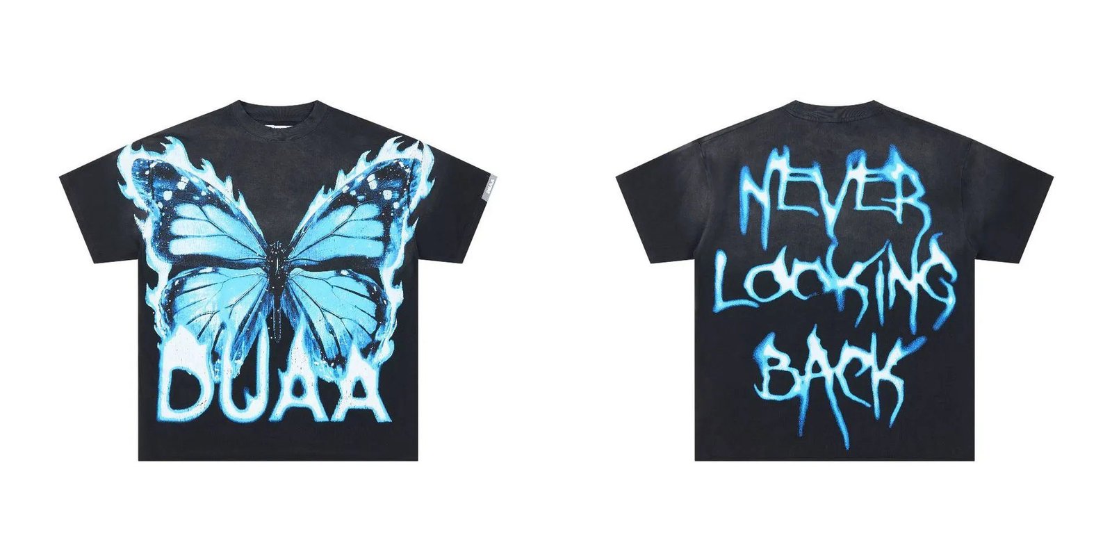 This is the black and blue color-blocked short-sleeve T-shirt from the butterfly print collection of original streetwear brand DUAA.