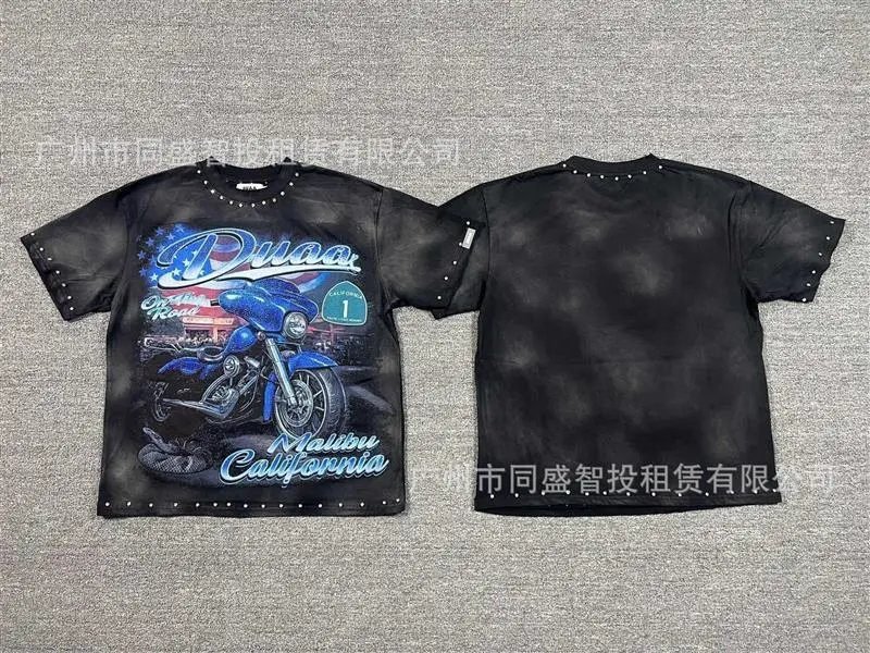 This is the black vintage printed short-sleeve T-shirt from DUAA’s motorcycle theme series. Made of heavy-weight combed pure cotton, it is skin-friendly, breathable and resistant to deformation. High-fastness direct digital printing technology is applied to restore the details of motorcycles. Featuring American retro street style, it is versatile and flattering for all body types, and is a well-received popular trendy item deeply sought after by cool fashion lovers.
