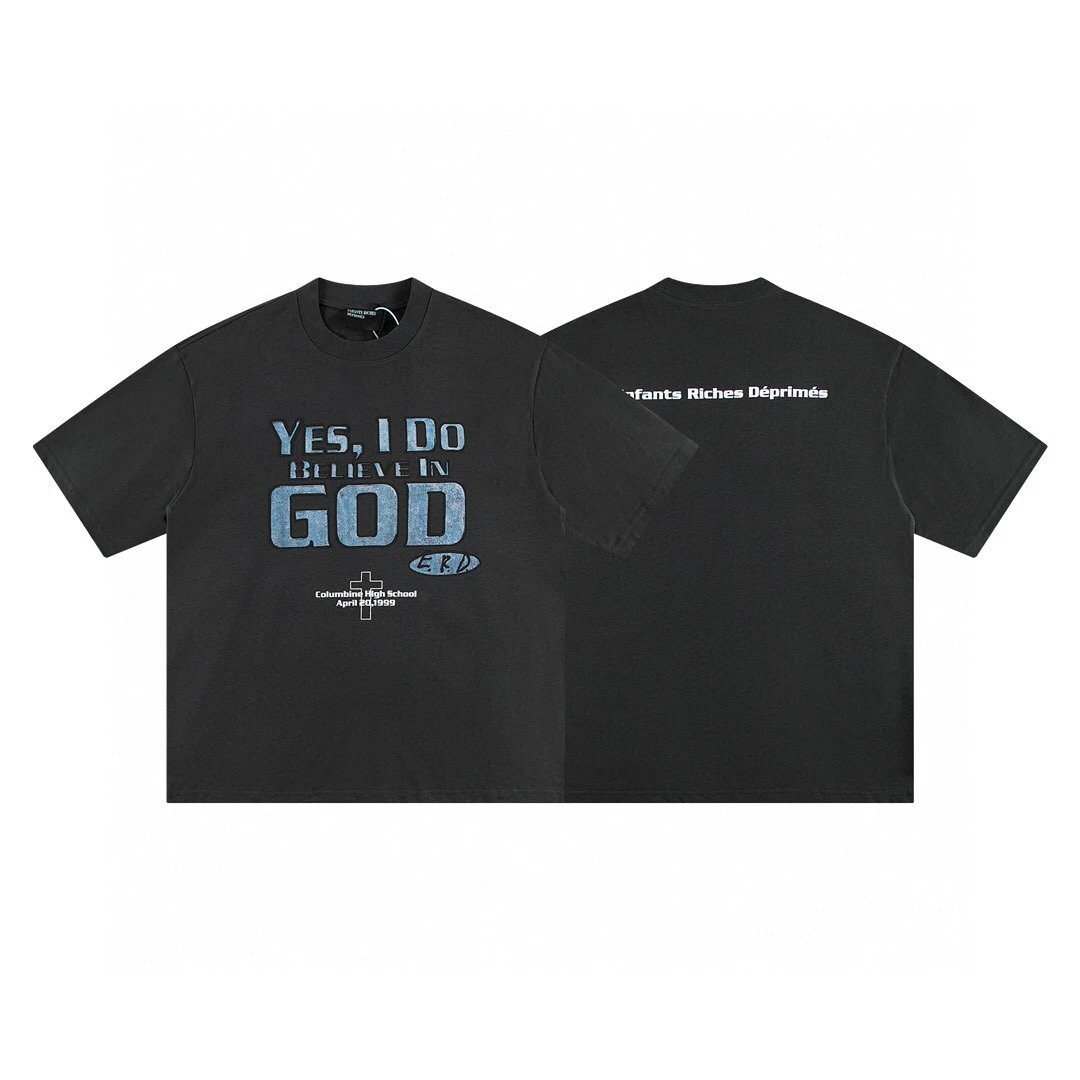 This is a dark-style black T-shirt printed with ERD faith slogan from the ERD GRJKD series of the streetwear brand. Made of heavyweight pure cotton with distressed cracked printing technique, it is structured, breathable and not easy to deform. Its distinctive dark high-street style is eye-catching and fits various daily outfits. Deeply loved by fashion trendsetters, it is a hugely popular well-received hit item in the streetwear circle.