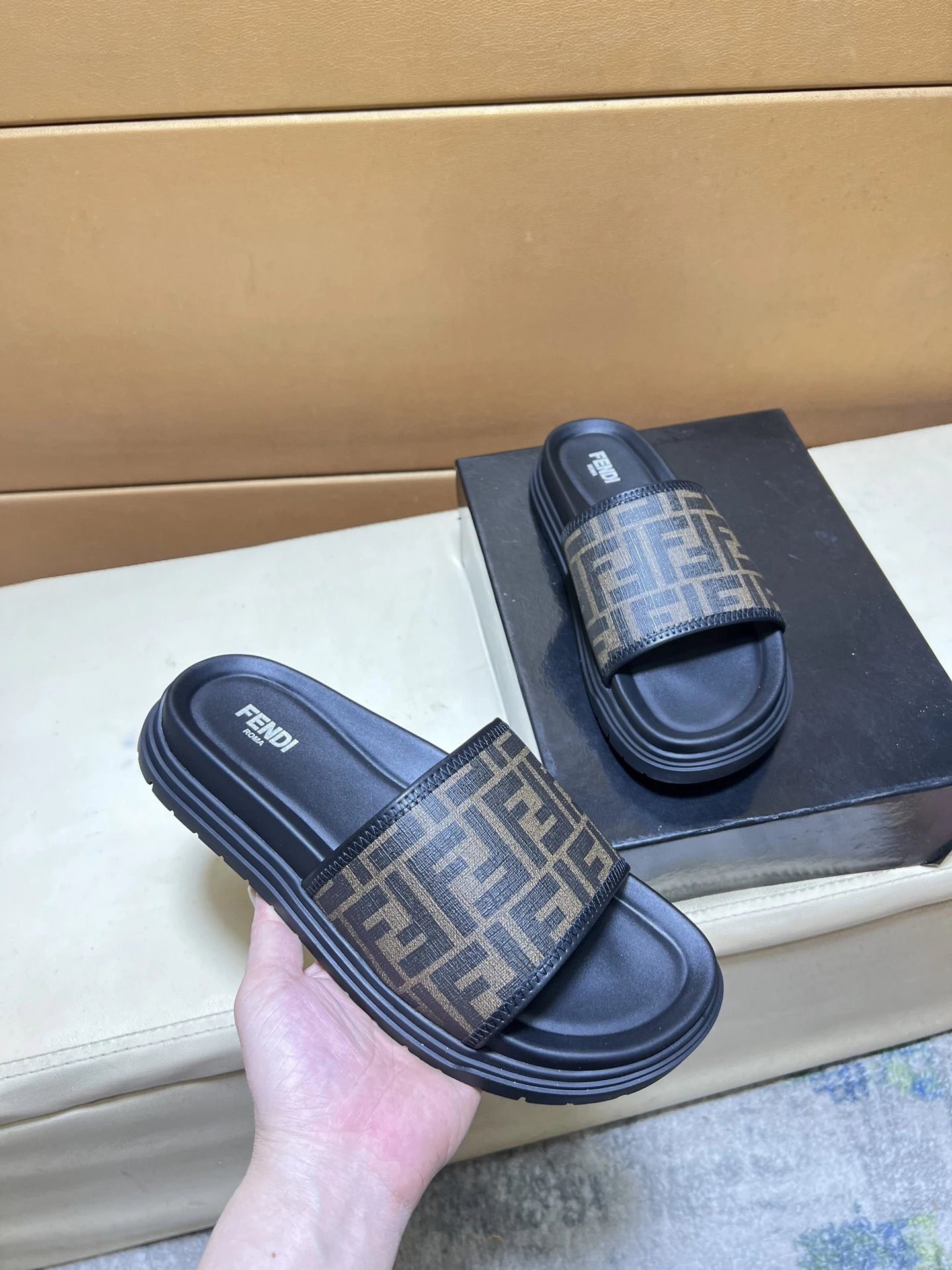 The upper is crafted from skin-friendly tanned fabric printed with the brand’s iconic FF monogram pattern, matched with a high-elasticity non-slip rubber sole. It adopts exquisite original factory edge-wrapping technology with neat and durable stitching.