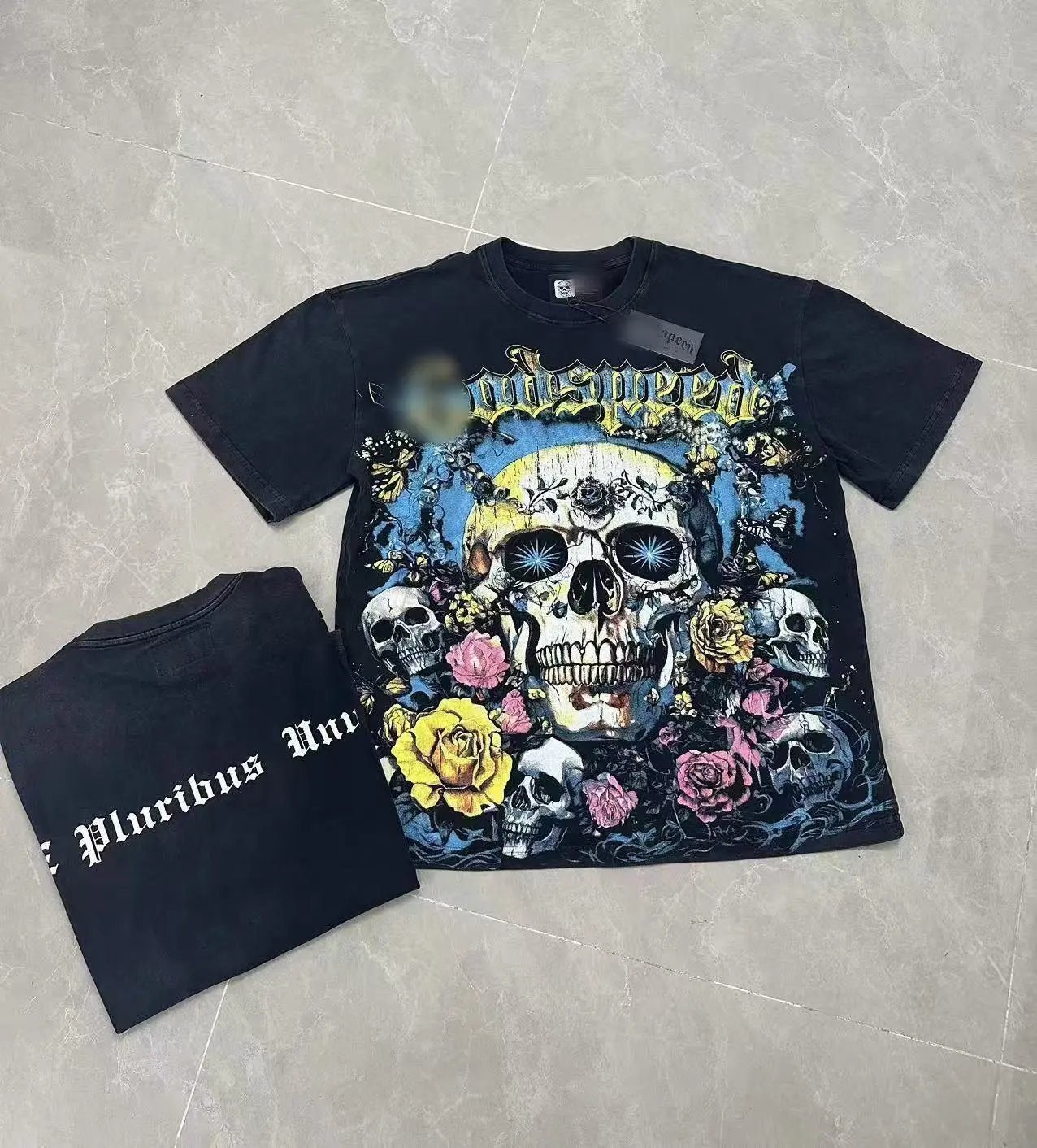 This black gothic short-sleeve T-shirt featuring skull rose design from the Godspeed collection under GOD is crafted from heavy-weight combed pure cotton. It is skin-friendly, breathable, well-structured and holds shape nicely without sagging. The print adopts imported eco-friendly offset printing technology, which stays durable, firm and crack-resistant for long.