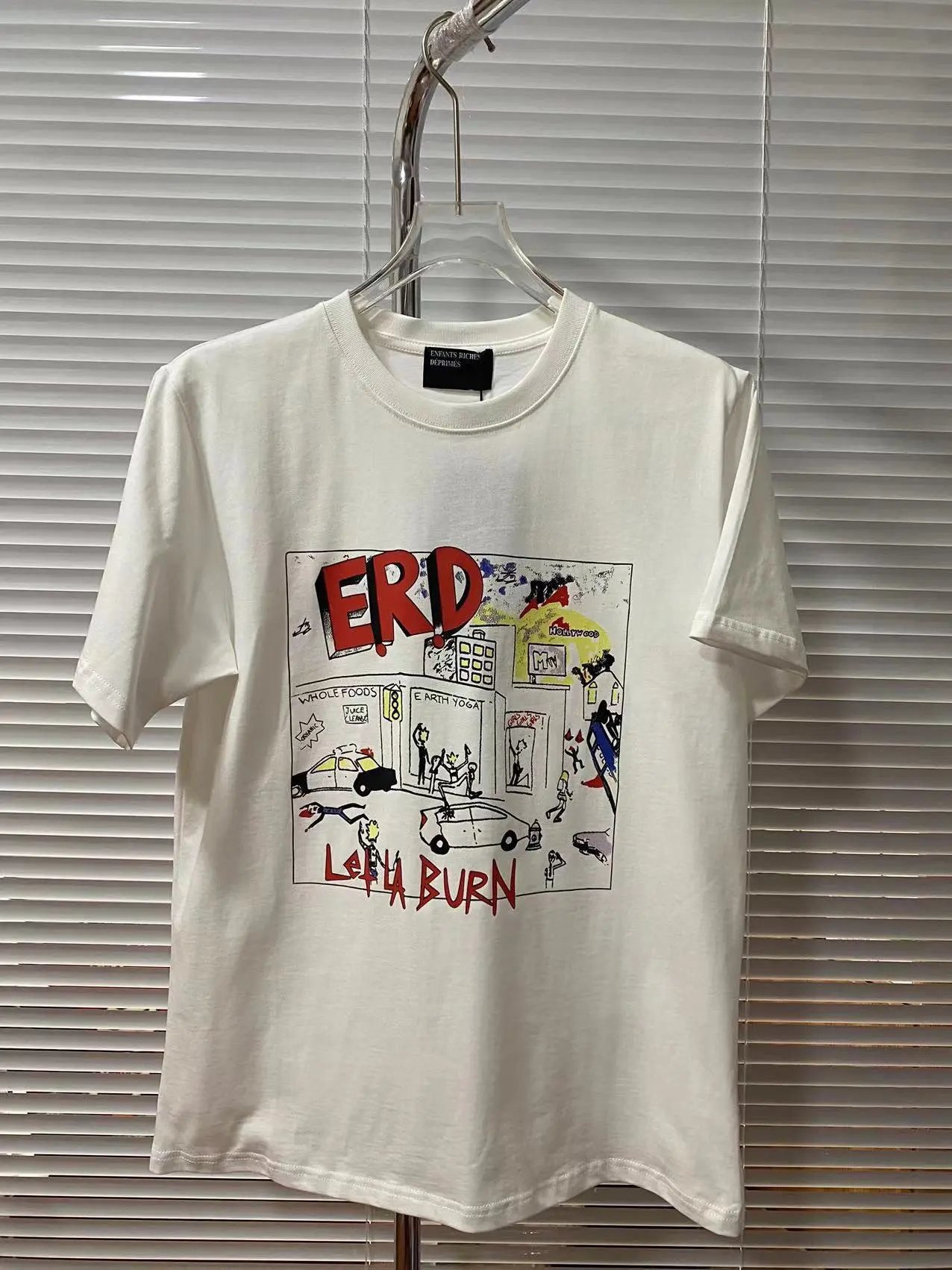 This is a white T-shirt with ERD graffiti style from China Selected. It is made of selected high-quality pure cotton material, with a soft and skin-friendly hand feel. It adopts exquisite printing technology, and the graffiti pattern is full of personality. The style is trendy and avant-garde, full of street sense. With its unique design and high quality, it has an excellent reputation among streetwear brand lovers and is the best choice to show a personalized outfit.