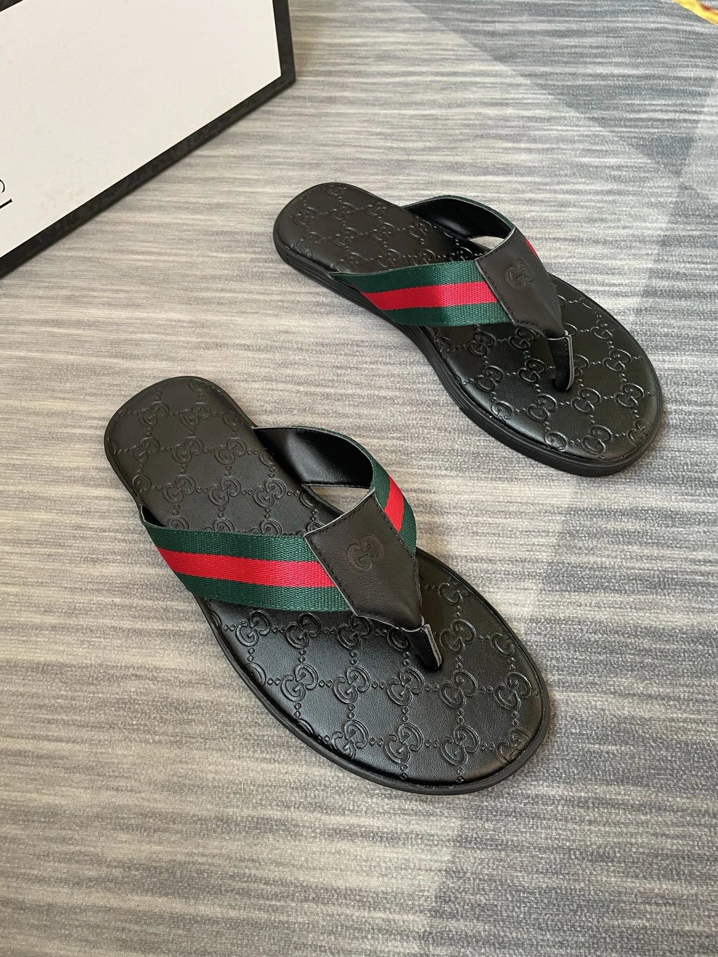 This is the black casual flip-flop from Gucci’s **Classic Monogram Collection**. Made entirely of high-quality non-slip rubber, it adopts the brand’s original factory aligned monogram printing and dyeing process, with neat stitching and solid workmanship. Featuring a casual, laid-back luxury style, it is suitable for various scenarios including daily outings and seaside vacations. It is a popular hit highly sought after by fashionistas around the world, which is easy to style and exudes premium class.