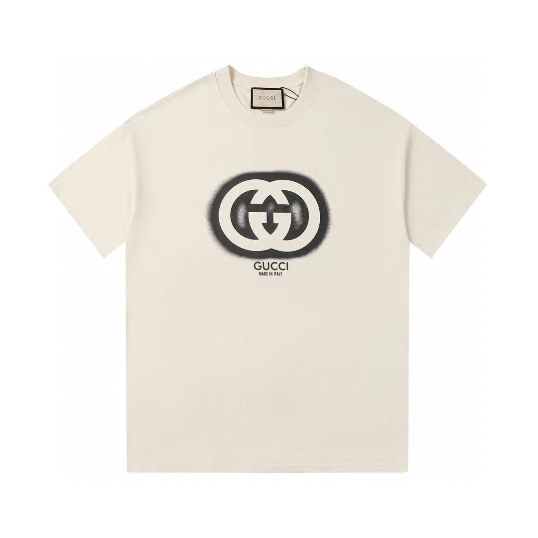 Gucci Classic Double G Print Series Off-White Vintage T-Shirt. Crafted from high-count combed pure cotton, it is breathable, skin-friendly, comfortable and durable. The brand’s iconic Double G logo is treated with a specialized color-fixing printing process, which keeps the pattern clear and fade-resistant. Boasting an outstanding retro luxury street style, it is a popular perennial bestseller of Gucci, adored by fashionistas across the globe. It matches perfectly with all kinds of bottoms and is a must-have classic item for any street fashion wardrobe.