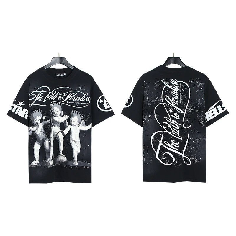 The black street-style T-shirt with Hellstar angel print is launched by American streetwear brand Hellstar. As a part of the brand’s popular print collection, it is made of heavyweight pure cotton and adopts high-definition color-fixing printing technology. Breathable, skin-friendly and deformation-resistant, it features a loose fit that suits all body types. It is a widely acclaimed hit in the streetwear community, and looks extremely eye-catching when paired with cargo pants or jeans.