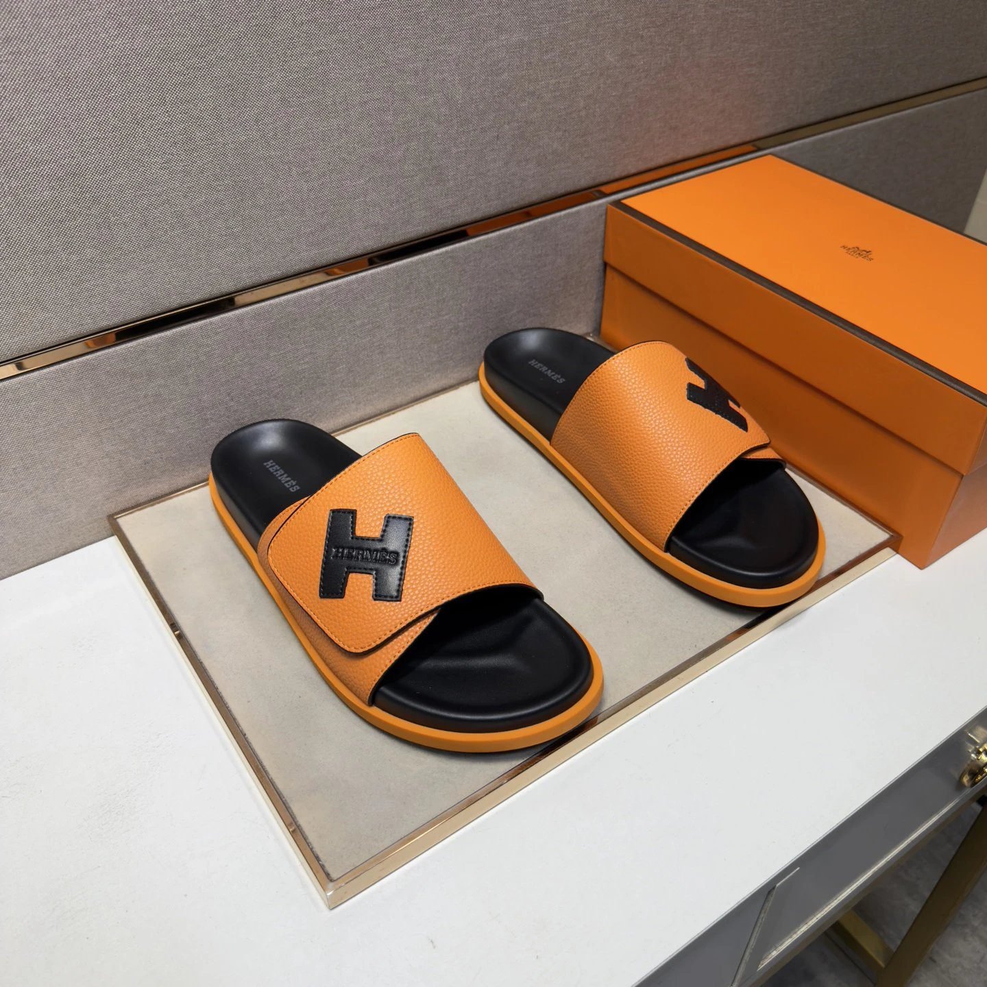 Hermès H-Series Orange and Black Color-blocked One-strap Slide Sandals. The upper is crafted from imported top-grain calfskin, featuring an iconic embossed H logo with exquisite craftsmanship. The edges are hand-polished with meticulous attention to every detail. The sole is made of high-elasticity non-slip rubber, offering a comfortable fit that won’t tire your feet even after long hours of wear. As an entry-level staple of classic light luxury, it is deeply favored by trendsetters and light luxury enthusiasts for its minimalist and premium texture. It pairs effortlessly with any outfit for daily outings and vacations, and is a highly-rated popular bestseller of Hermès.