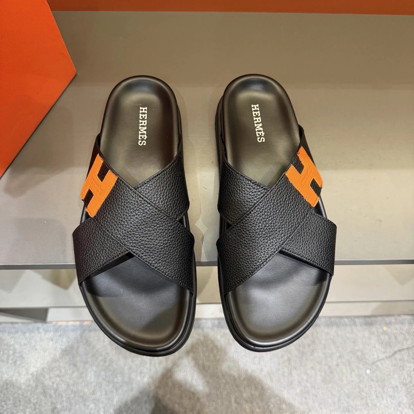 This is Hermès’ classic Oran series black and orange colorblock H-logo casual slide sandal. The upper is crafted from imported top-grain calfskin, which is breathable, comfortable to wear, and can nicely flatter your foot shape. Adopting the brand’s iconic hand-finished edge craftsmanship, the three-dimensionally embossed glossy H logo boasts a premium texture.
