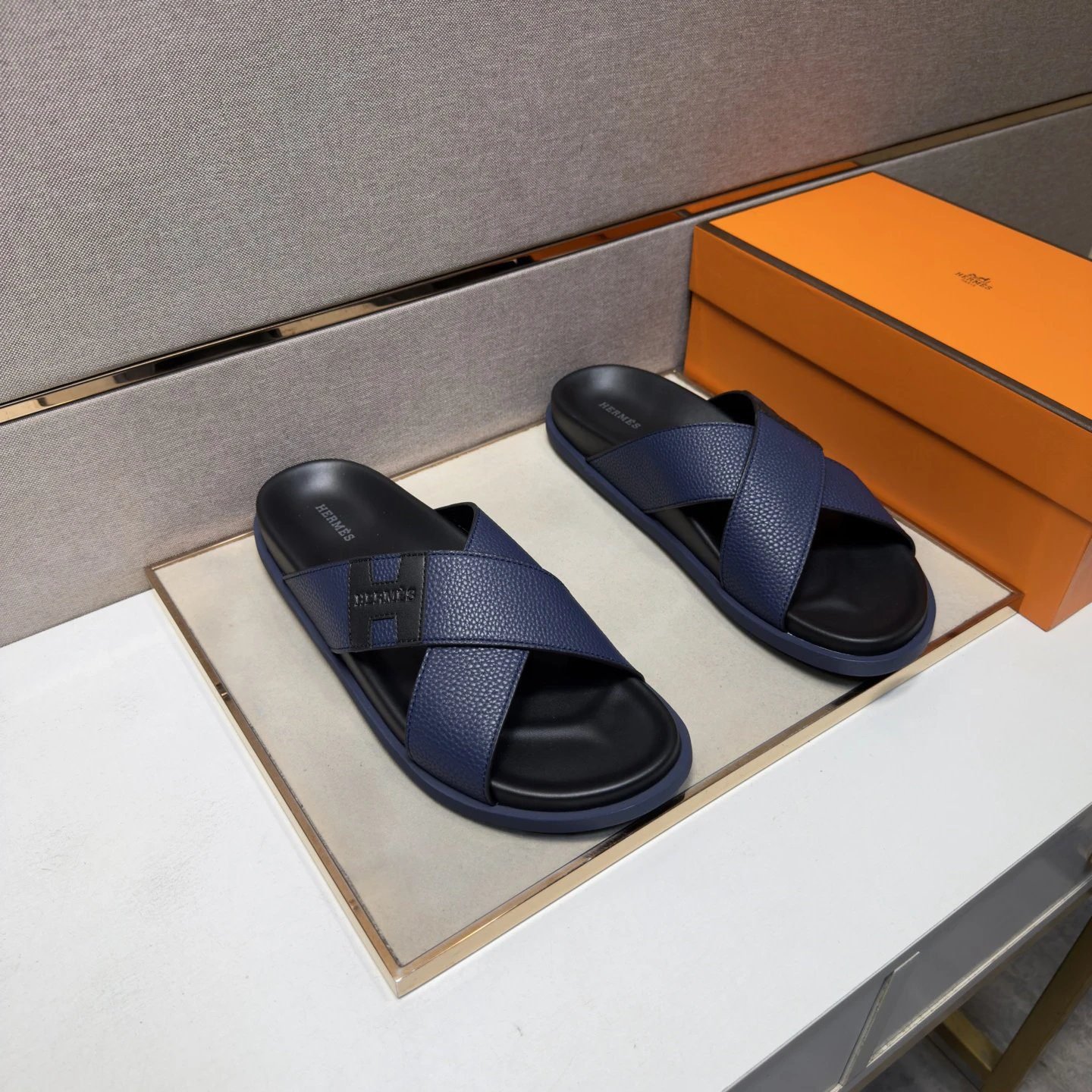 Hermès Classic Interlaced H Logo Collection Navy Blue Outdoor Slide Sandals. The upper is crafted from imported top-grain calfskin, featuring exquisite hand-sealed edge craftsmanship with neat stitching and exceptional texture. Boasting a minimalist luxury style, these sandals are suitable for various occasions such as leisure and vacation. They are breathable, comfortable and will not rub your feet when worn, highly sought after by minimalist luxury lovers around the world, and perfectly match all kinds of daily outfits.