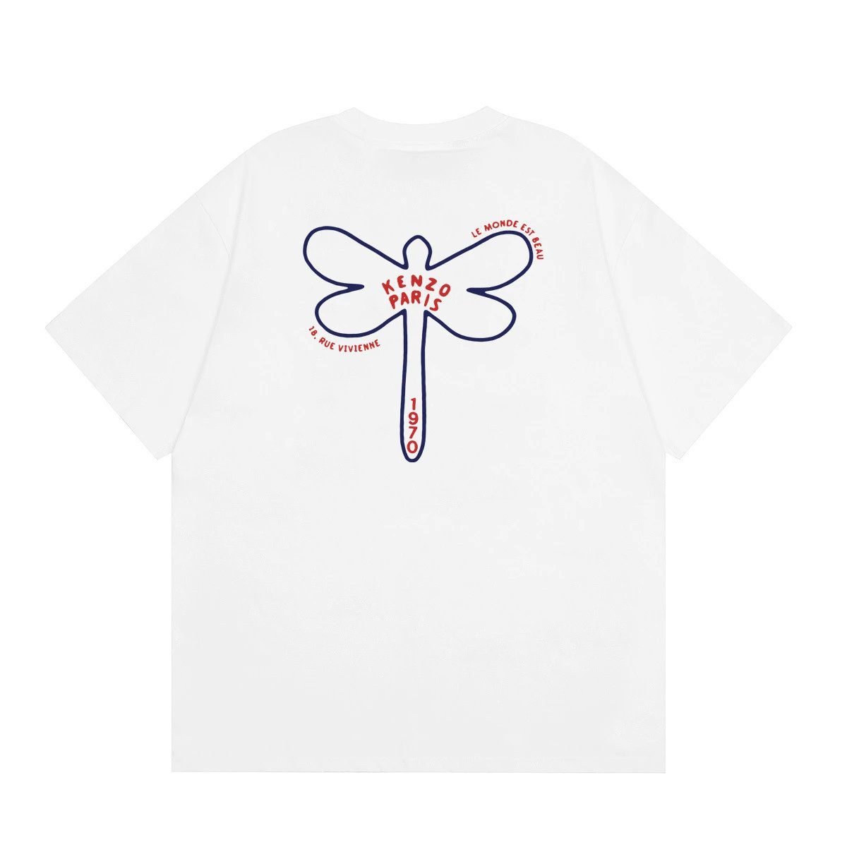 This casual white T-shirt from the dragonfly print collection of high-end French streetwear brand KENZO is made of high-count combed pure cotton fabric. It is breathable, skin-friendly and suitable for wear in all seasons. It adopts reactive eco-friendly printing and dyeing technology, so the dragonfly print is clear, three-dimensional and will not fade after repeated washing. With a loose fit that suits all body types, it is casual and adaptable to multiple scenarios such as street outing and daily commuting. It pairs well with jeans and cargo pants, and is a popular, well-received item deeply favored by young people in the streetwear circle.