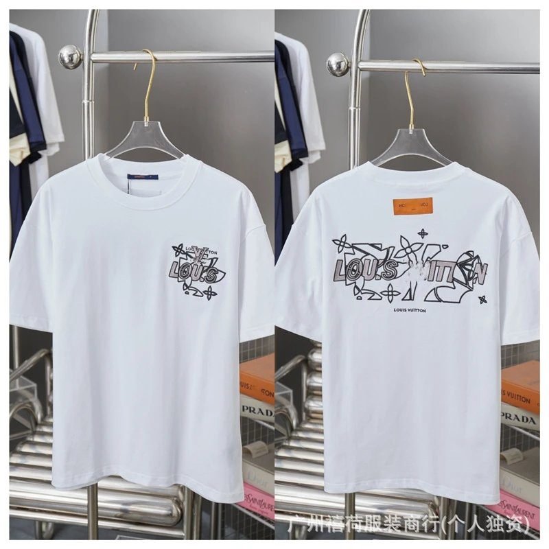 Louis Vuitton Graffiti Trend Collection White Short-sleeve T-Shirt. Made of selected high-count heavy-weight pure cotton, it adopts high-end color-fixing direct digital printing technology. Integrating the classic LV logo with avant-garde graffiti design, it creates a cool street trendy style. The loose fit suits all body types, and the piece is eye-catching and versatile for daily outings. It is a popular luxury street fashion item deeply sought after by trendsetters.