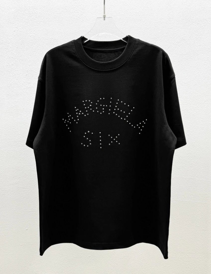 Maison Margiela MM6 Collection Edgy Black Rhinestone-embellished Short-sleeve T-shirt. It is crafted from heavyweight skin-friendly pure cotton, which is breathable, structured and not easy to deform. Featuring exquisite eye-catching 3D rhinestone craftsmanship, it carries on the brand’s avant-garde, niche and edgy style. It is highly versatile, pairing perfectly with jeans and sweatpants for impressive shots, and is a popular item highly sought after by young trendsetters nowadays. Boasting an outstanding reputation, it is comfortable to wear and suits all body types.