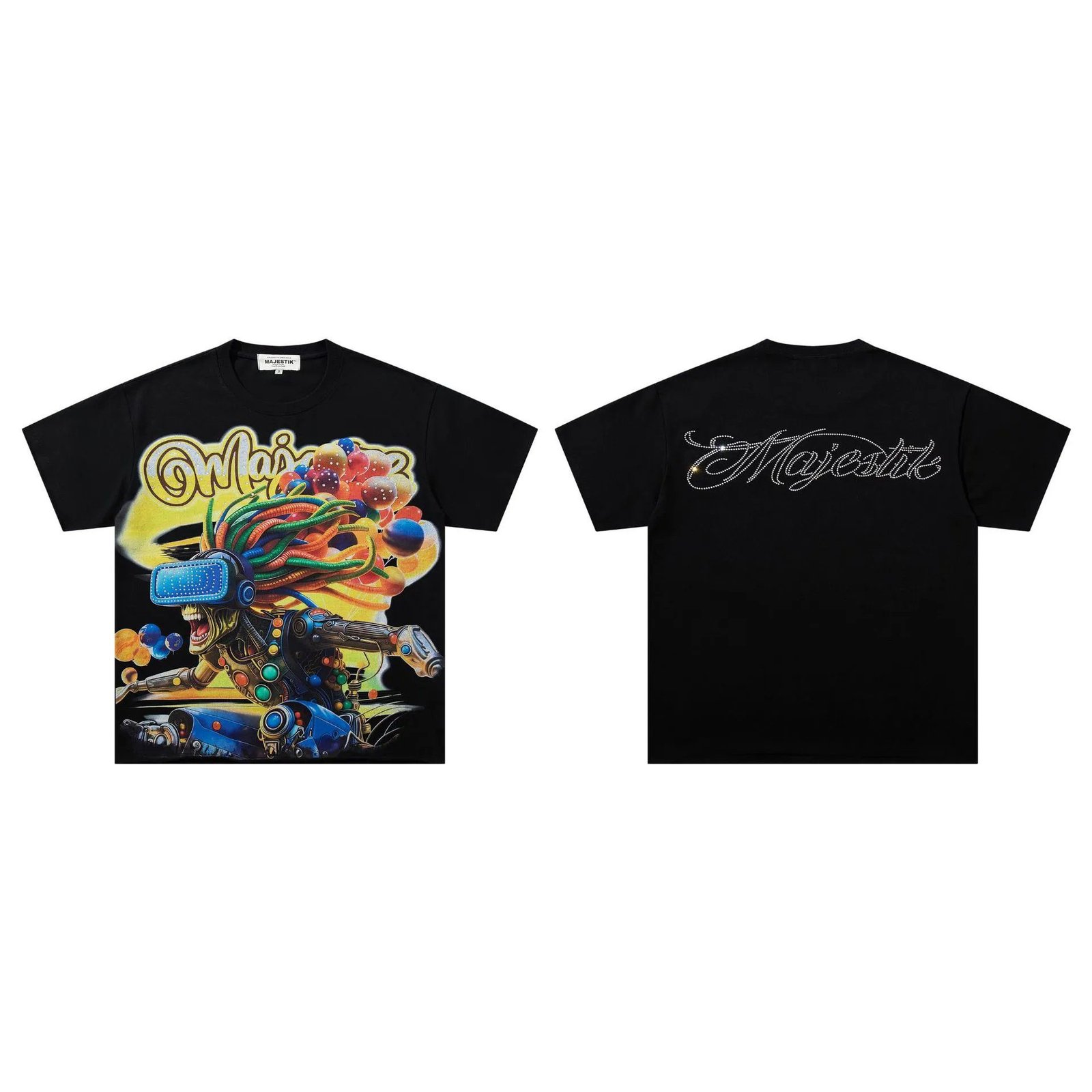 MAJESTIK Cyber Print Series Street Style Black T-Shirt. Made of selected heavy-weight pure cotton fabric, it is skin-friendly, breathable and keeps its shape well after repeated washing. Adopting high-definition digital direct printing technology, the prints on this T-shirt are clear, firm and crack-resistant. Cool, eye-catching, casual and versatile, it is deeply favored by street trend enthusiasts and is a popular trendy item for daily street wear.