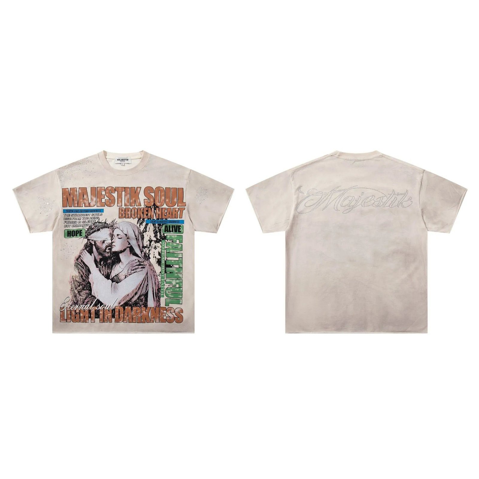 This off-white T-shirt with religious print from the vintage collection of streetwear brand MAJESTIK is made of heavy-weight skin-friendly combed pure cotton. It adopts high-definition colorfast digital printing to restore the details of vintage religious patterns, and features the iconic American retro street style. With a loose fit that offers great inclusivity for all body types, it is versatile for daily wear and rarely clashes with others’ outfits. Deeply favored by trendy toy enthusiasts, it is an acclaimed popular staple for retro-inspired outfits.
