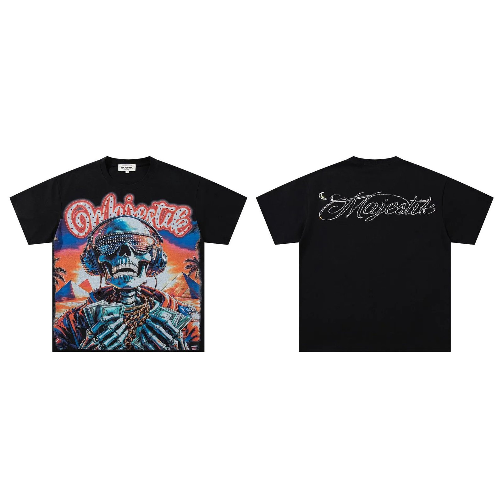 MAJESTIK Skull Print Series Hip-hop Style Black Short-sleeve T-shirt is a popular hit item of the trendy brand MAJESTIK. Made of selected premium pure cotton, it is breathable, skin-friendly, comfortable and well-shaped. It adopts high-definition color-fixing printing technology, so the skull pattern is clear and fade-resistant. Featuring American street hip-hop style, its loose fit fits all body types and is versatile for daily streetwear. Widely favored by hip-hop trendsetters around the world, it is a well-reputed trendy item.