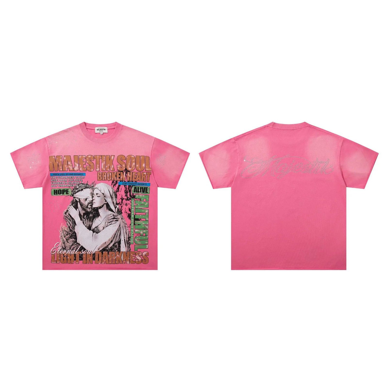 This is the vintage printed pink short-sleeve T-shirt from the MAJESTIK SOUL series of streetwear brand MAJESTIK. Made of selected premium heavy-weight high-count pure cotton, it is breathable and skin-friendly, which keeps you away from stuffiness and sweat in summer and remains crisp without deformation after repeated washing. It adopts high-fastness vintage reactive printing technology, delivering richly layered patterns that will not fade. Featuring American street vintage style, its loose fit is highly inclusive for all body types and can be easily matched with jeans and cargo pants. It is a popular summer streetwear staple loved by global trendsetters, and enjoys outstanding reputation and wide acclaim.