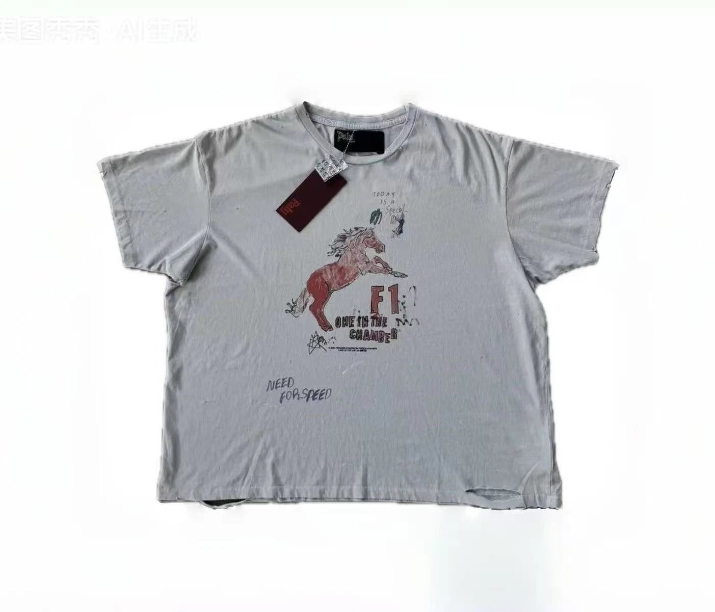 Light gray short-sleeve T-shirt from the Red Horse Retro Collection of streetwear brand Paly Hollywood F1. It is crafted from high-count heavyweight pure cotton, which is skin-friendly, breathable and free of stuffiness even when sweating. The red horse-themed print adopts eco-friendly color fixation technology, featuring good wash resistance with no color bleeding or cracking. Boasting an American street retro style, this T-shirt is versatile, flatters all body types, and fits various occasions including daily outings and commuting. It is a popular item highly sought after by trend lovers and has won wide acclaim since its launch.