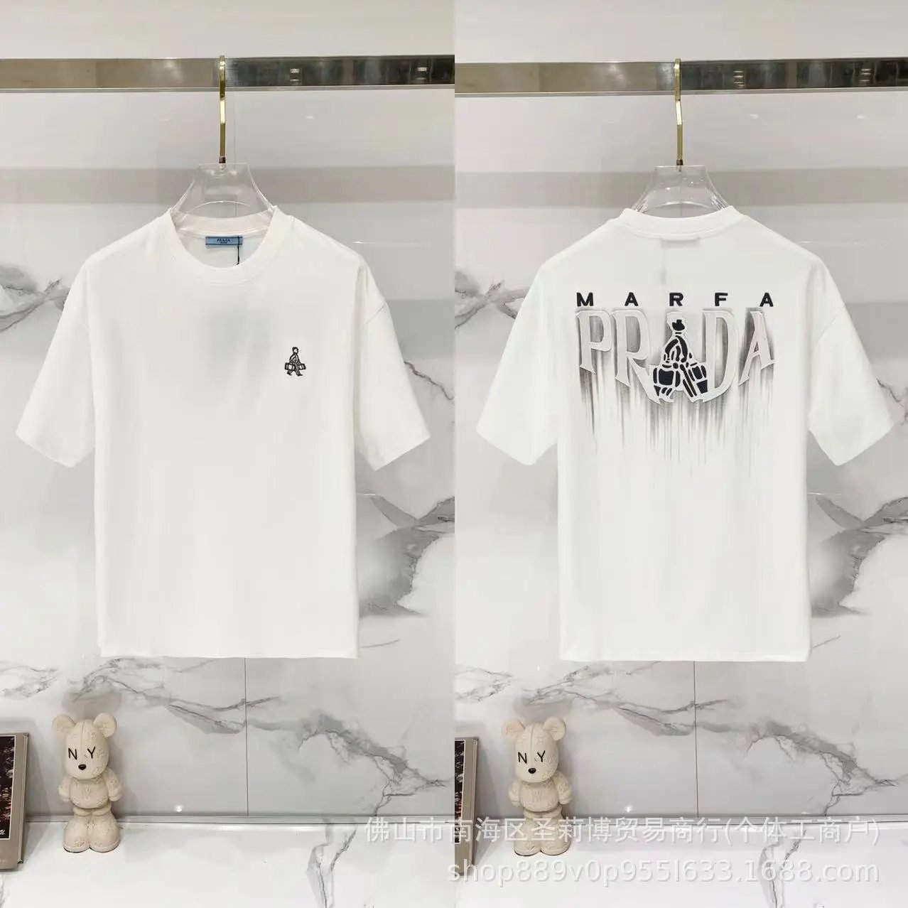 Prada MARFA Series streetwear-style white short-sleeve T-shirt. Crafted from high-count heavyweight combed pure cotton, it is skin-friendly, breathable, structured and less prone to wrinkling. The neckline features double-needle reinforced edge-locking craftsmanship, and the print is finished with matte anti-peeling treatment. Boasting a minimalist retro cool street style and a loose fit that fits all body types, it is versatile enough to pair with various bottom pieces for daily wear. As a popular item highly sought after in the trend circle, it is deeply loved by trendy toy enthusiasts.