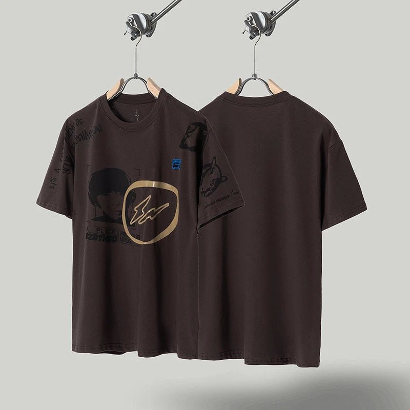 This is the dark brown printed short-sleeve T-shirt from Travis Scott’s Street Rap Series. The entire garment is made of 100% heavyweight skin-friendly pure cotton fabric, which is breathable, sweat-absorbent and non-stuffy. The print adopts eco-friendly high-definition direct printing technology, featuring stable color that will not crack after washing. Boasting the iconic American street hip-hop style, the loose fit has great inclusivity for different body shapes. It pairs perfectly with jeans or cargo pants for daily wear and always looks great in photos. As a popular hot item widely sought after in the trend circle, it is deeply loved by street fashionistas and rap culture enthusiasts.