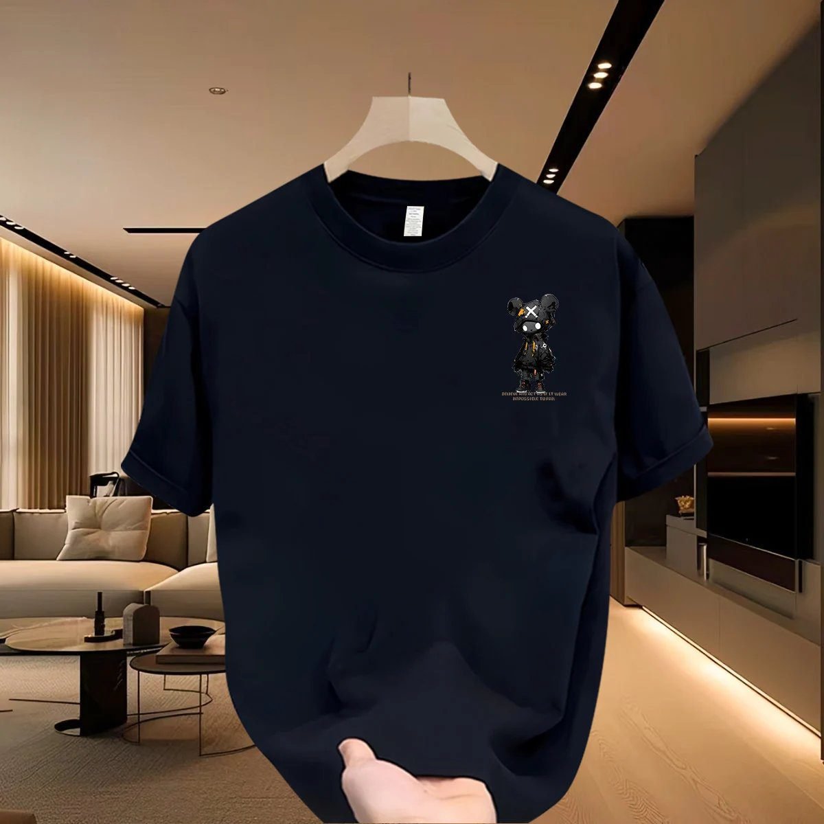 This dark blue short-sleeve T-shirt from the Street Collection of Bearbrick, the viral trendy brand on Instagram, is crafted from skin-friendly combed pure cotton. The Bearbrick graphic is made with direct-to-garment digital printing and color-locking technology, which is wash-resistant and won’t crack after repeated washing. Featuring a classic edgy street style, its loose fit fits most body types perfectly. Highly praised among fashion circles, it is a go-to streetwear staple for trendsetters, and looks extremely eye-catching when paired with workwear or jeans.
