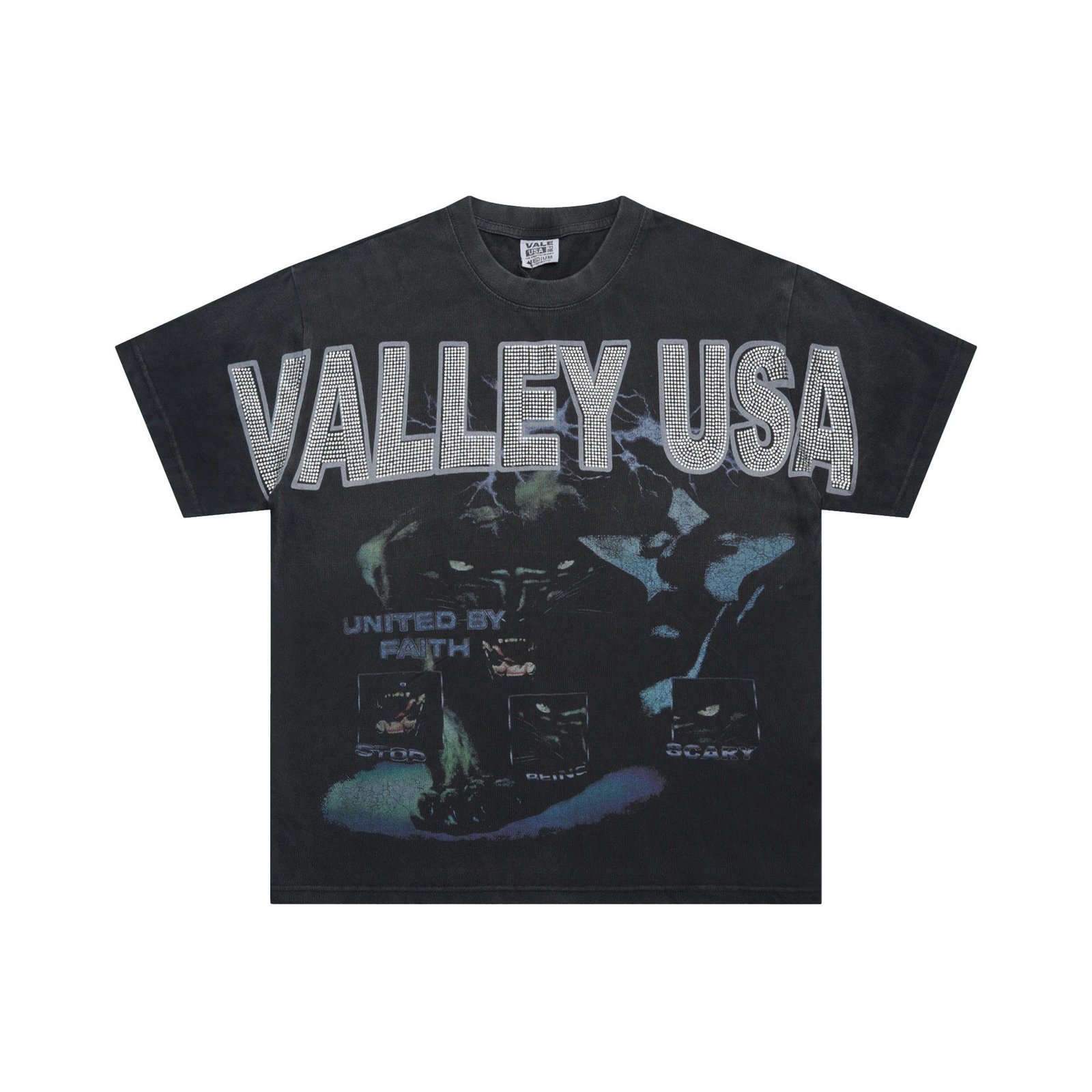 Trendy brand Valley (Valley USA) Valley Series Black Street-style T-shirt is crafted from skin-friendly, breathable heavy-weight pure cotton, and features exquisite and durable hot-fix rhinestone craftsmanship. The personalized eye-catching design prevents rhinestones from falling off easily, delivering a strong street fashion vibe. The loose fit flatters all body types, is easy to style and perfect for photos. As a versatile out-and-about staple highly sought after by trend enthusiasts, it is suitable for various daily scenarios.