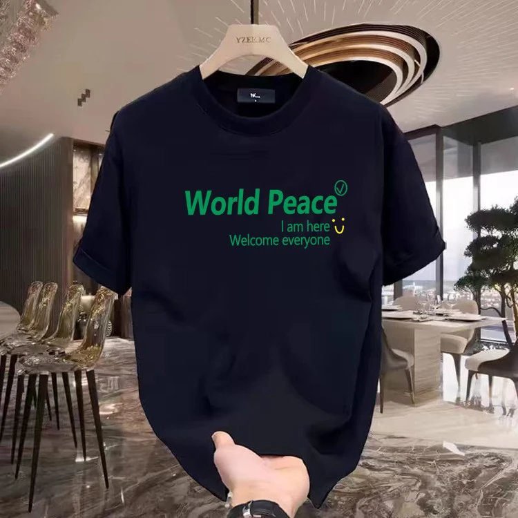 The YZELMC World Peace series dark blue T-shirt of China Selected is made of high-quality cotton fabric, which is comfortable and breathable. With a unique printing process, it shows personality. It has a street fashion style, is versatile and fashionable. This series has an excellent reputation and is a must-have item for trendsetters. It can easily create a cool and handsome look and show unique charm.