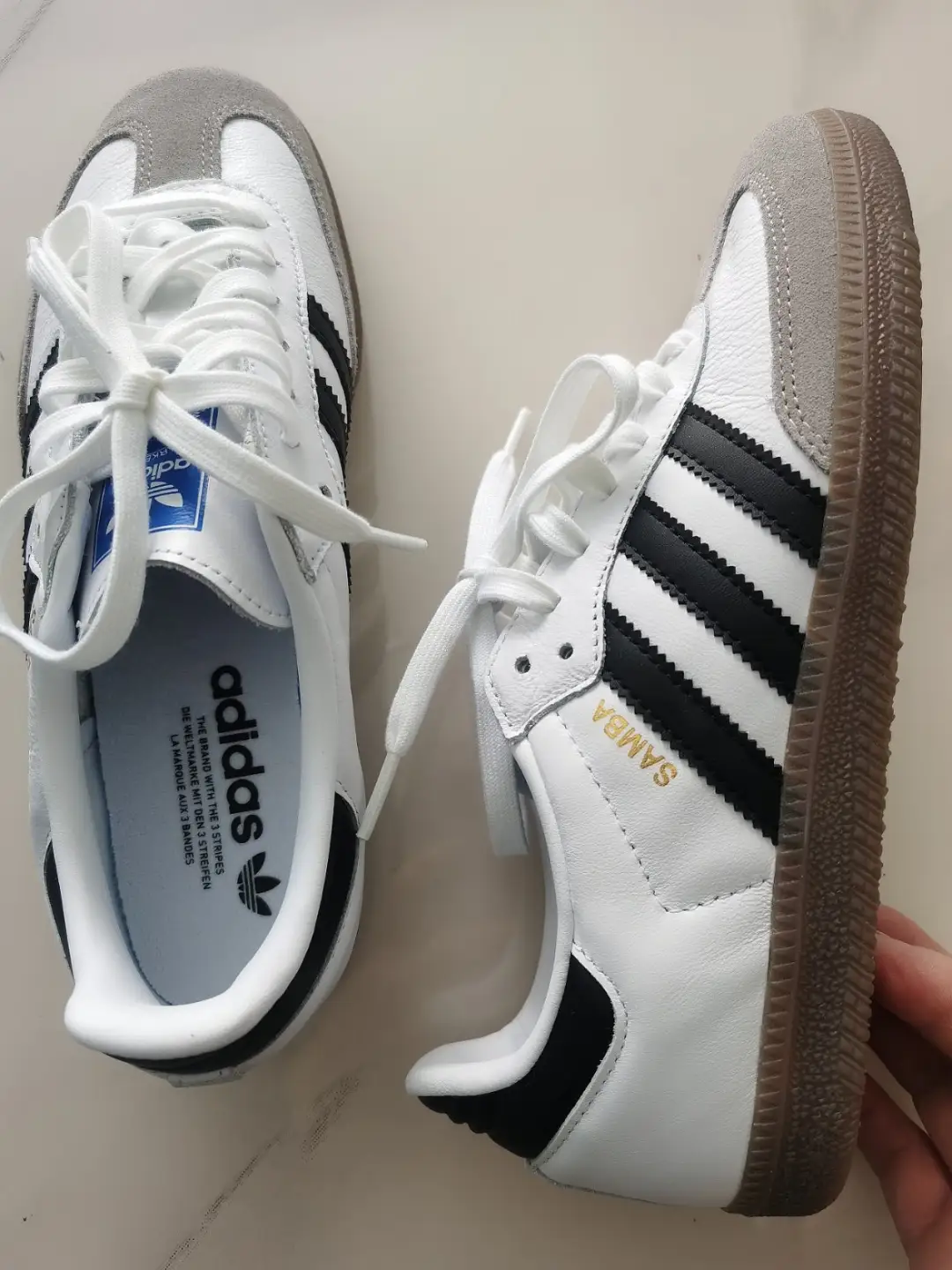 Adidas Samba. Retro style, the classic German training model. The sole is thin and a bit stiff, but it gets more comfortable with wear. I went with white too—mainly because it’s easy to pair with anything. Perfect for both work and shopping.