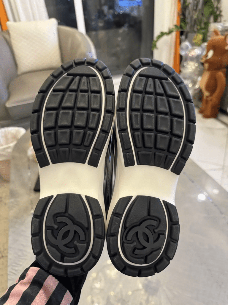 I was skeptical at first—could they really be identical? I started doing some research and discovered that many luxury brands actually have manufacturing facilities in China, and some factories produce their own versions. I also carefully examined the key authentication points for these shoes. One is the leather source: this model uses genuine lambskin, which is then coated with a metallic-finish cowhide overlay, giving the entire shoe a more structured and stylish look. Low-end knockoffs wouldn’t use such complex craftsmanship. Moreover, if a low-end version gets wet, it will crack, and the sheen will look unnatural—leading to that cringeworthy moment when everyone can tell it’s a fake. In sunlight, the genuine leather has a subtle color shift, with a hint of champagne gold undertone. The double C logo on both sides is clearly visible, and you can even sense the three-dimensional texture of the logo in the photos.